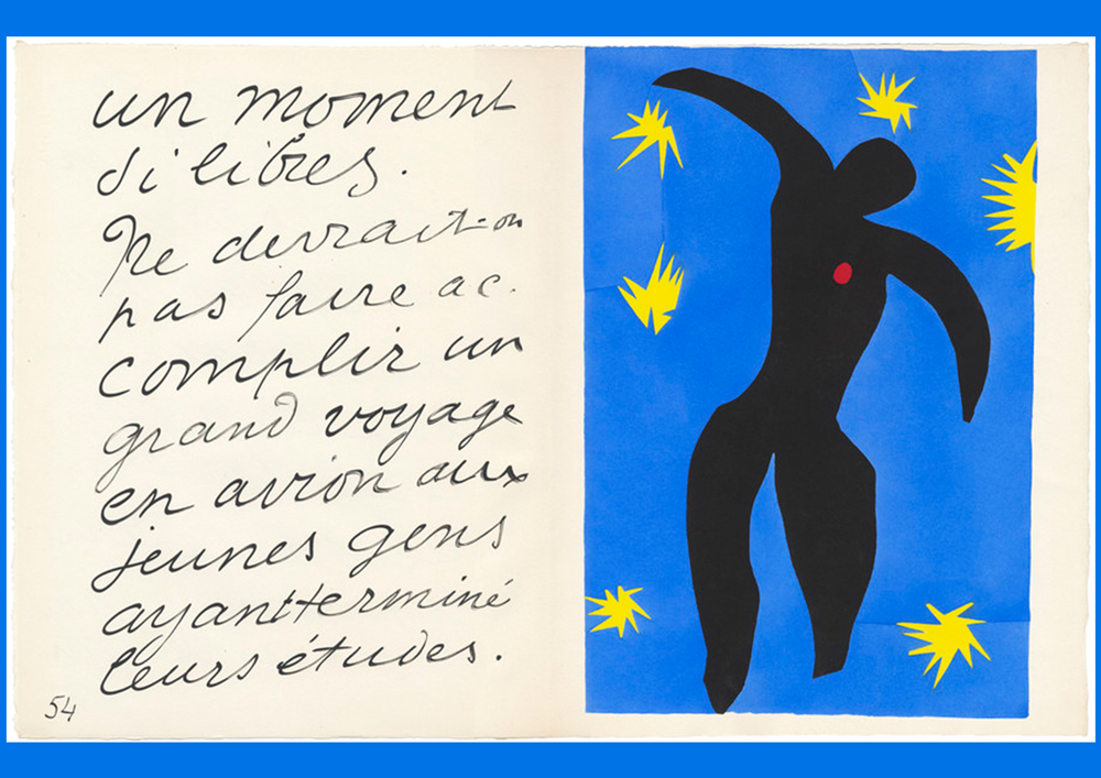 В чому секрет цієї книжки? Тут є те, чого не було у Пікассо. Пабло створював сюжет, який не співвідноситься з усім тілом книжки. Матісс, натомість, мислить розворотами. Художник працює з усім текстом, зображеннями й навіть білими пустотами. Він використовує склейку, яка складається з невеличких шматків, і це дає дуже складну палітру. Листи він спочатку покривав гуашшю. Тобто не використовував стандартизовані кольори, а підбирав їх художньо. В цій роботі застосована абсолютно несподівана для 1947 року інтенсивність кольору.