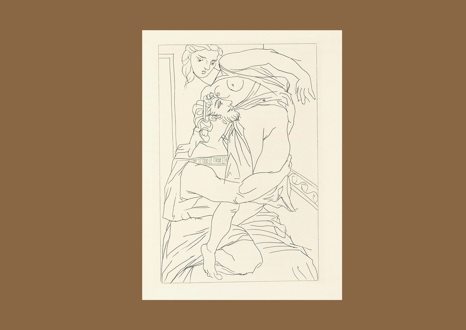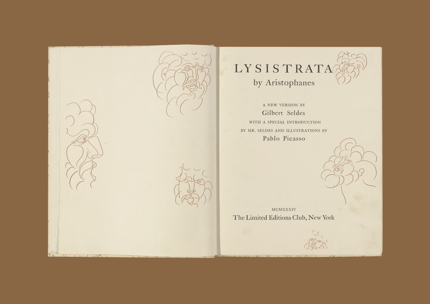 Пікассо у 20-х роках створив велетенську серію, яка зверталася до класичного мистецтва, до античності як такої. Вона була мальовничою, але у 30-х роках у нього ніби забрали колір і він перейшов у графіку, опанував техніку офорта. В 1934 році Пабло Пікассо ілюструє «Лісістрату» 6-ма офортами, вибраних видавцем з 18-ти створених художником за угодою.