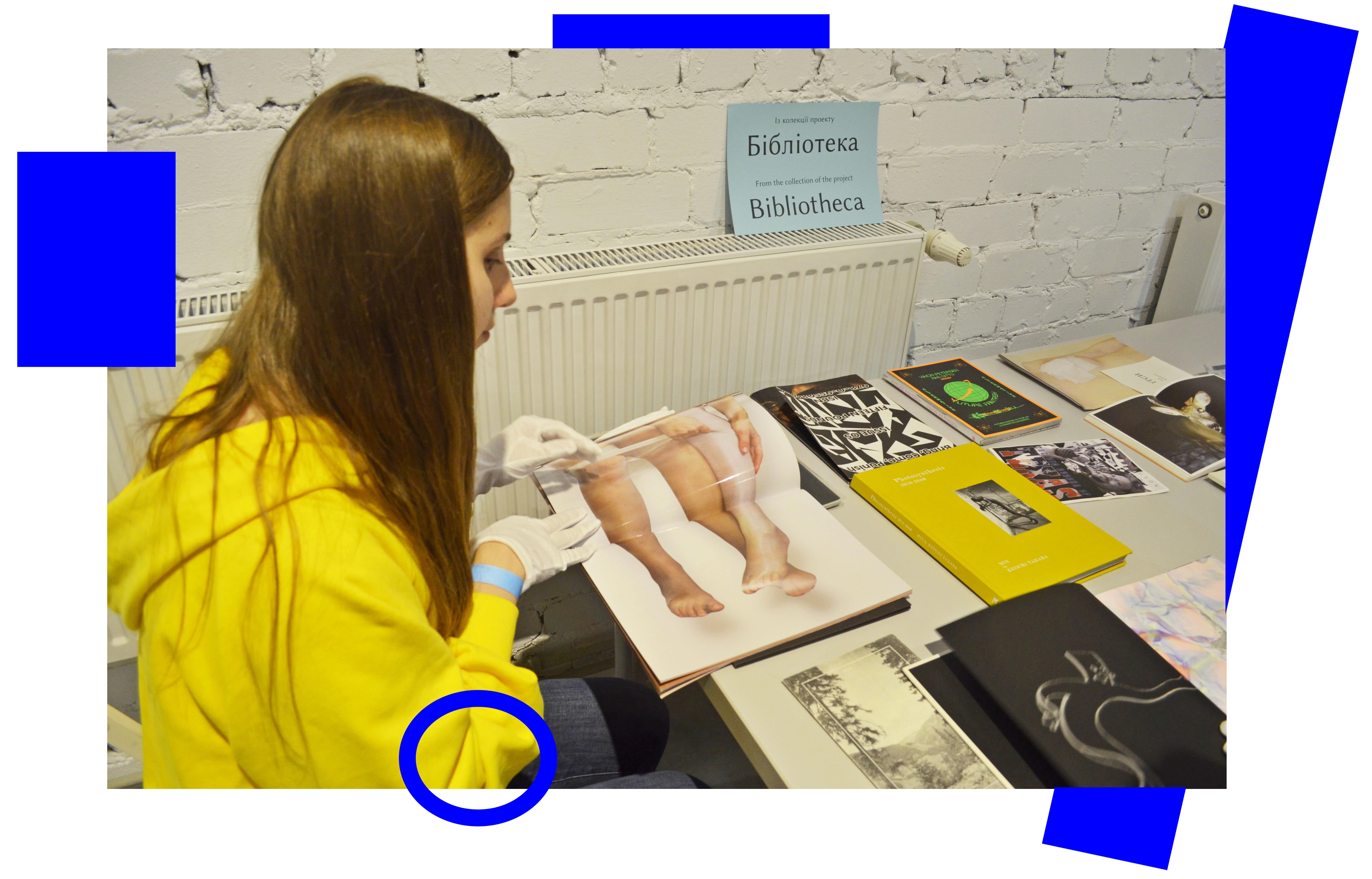 На світло-зеленій поверхні столу — чорні, жовті, червоні — різного розміру, товщини й текстури — фотокниги з бібліотеки фестивалю Kyiv Photo Book. Саме тут можна було погортати фотокнигу UNIT («Одиниця») британської авторки Сандри Джордан, книжку тбіліського фотографа й художника Вігена Вартанова, що складається з його робіт 1965—1975 років, чи книжку українського фотографа Максима Дондюка Culture of Confrontation («Культура конфронтації»).