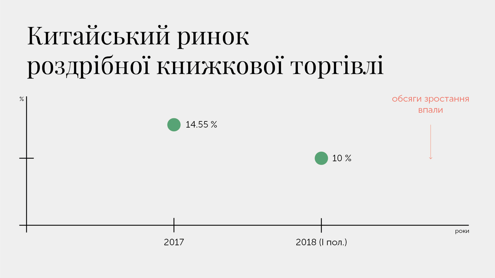 Загалом китайський ринок роздрібної книжкової торгівлі (за результатами звіту OpenBook) стабільно розвивався протягом минулого десятиліття. У 2017-му році зростання досягло 14.55%, але у першій половині 2018 року вони впали до 10%.