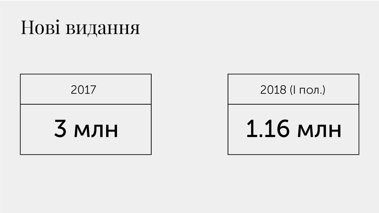 Якщо розглядати показники за виданнями, то обсяг загального зростання становить 2,53%. Між січнем та червнем 2018 року на ринку з’явилися 1,16 мільйона книжок. Минулого року загальна кількість проданих видань становила 1,89 мільйона.