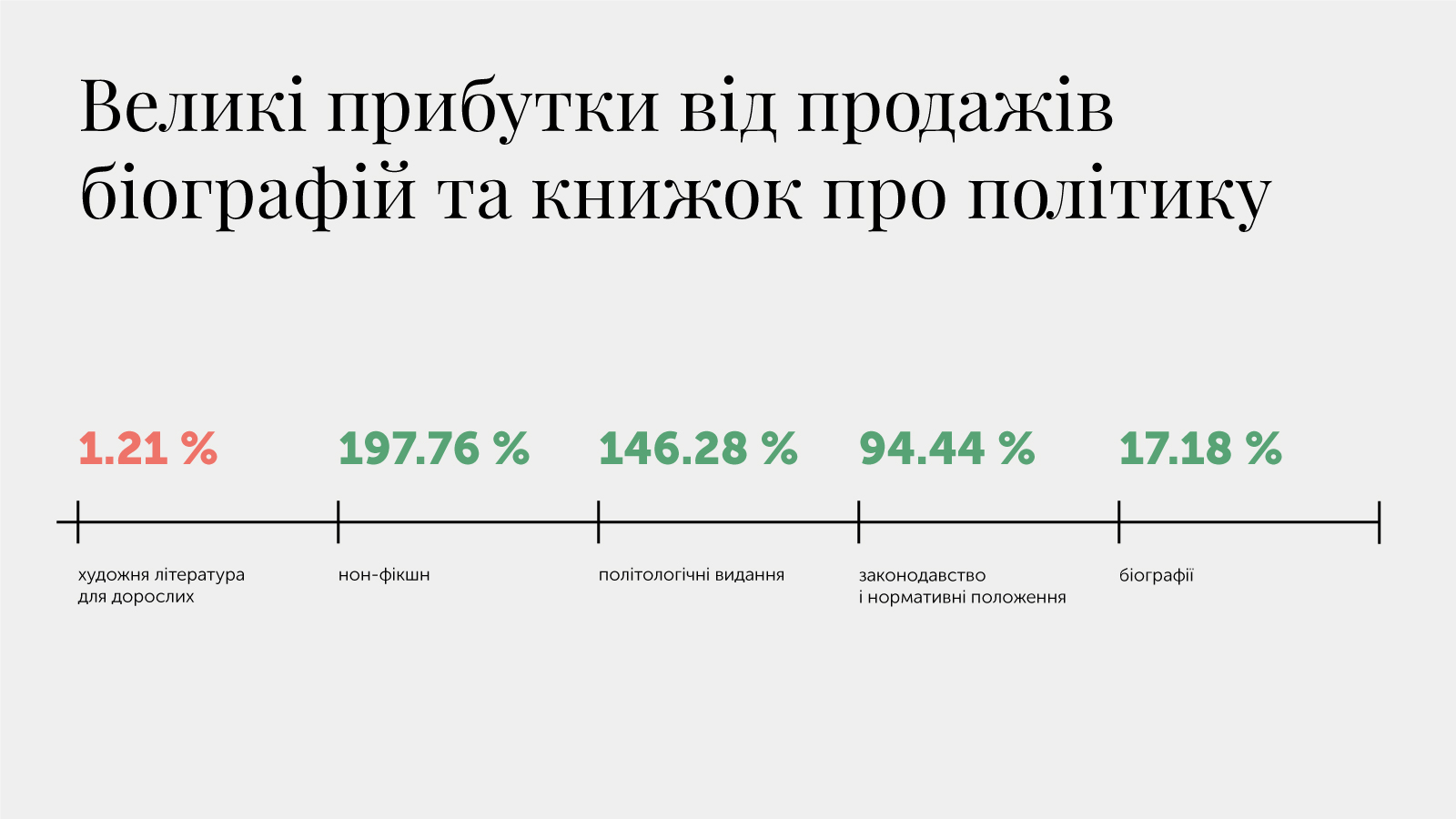 Художня література для дорослих демонструє падіння. Обсяги продажів знизилися з 12,94% до негативного показника 1,21%. Але у першій половині цього року відбувалося стабільне зростання у галузі видання нон-фікшну, особливо книжок про політику, обсяги продажів яких зросли на 197,76% у порівнянні з минулим роком.