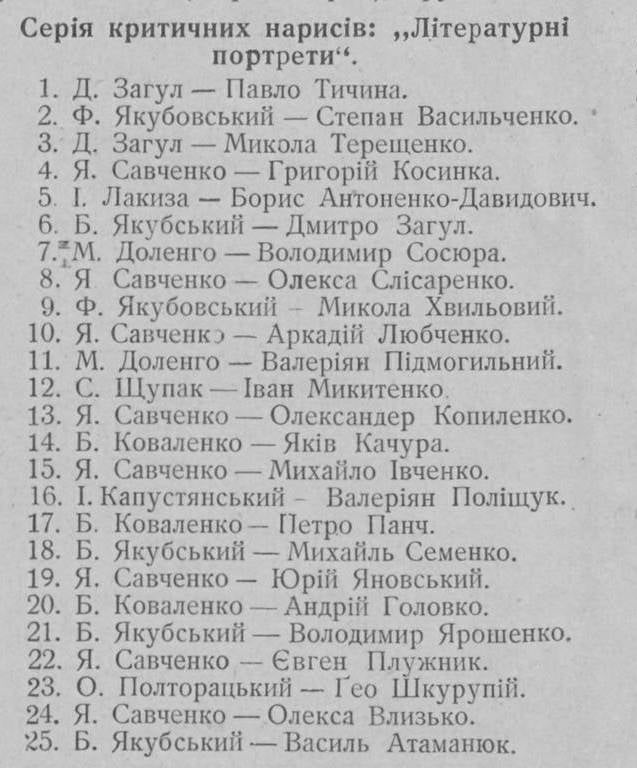 І тут бачимо весь спектр київських літературних організацій, крім неокласиків: «Західна Україна» (Загул), «Гарт» (Коваленко, Фальківський), «Ланка» (Підмогильний, Антоненко-Давидович, Косинка), «Жовтень» (Савченко, Терещенко), «Плуг» (Щупак).