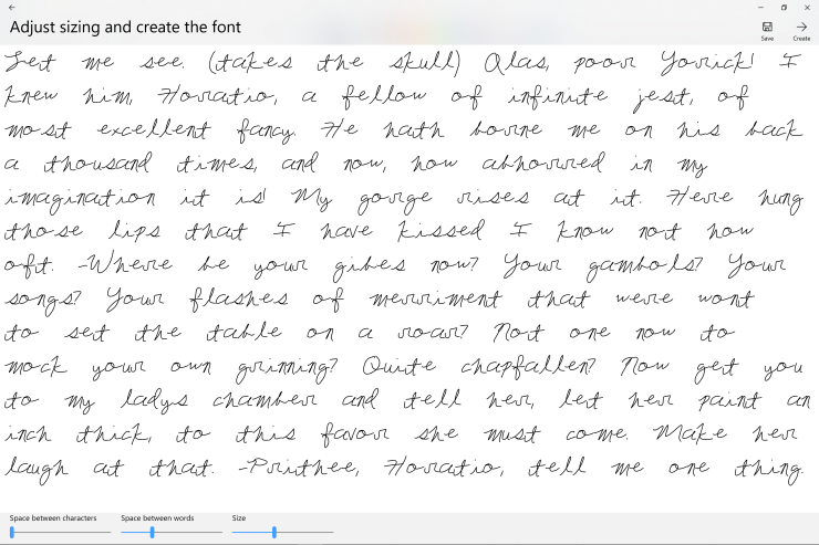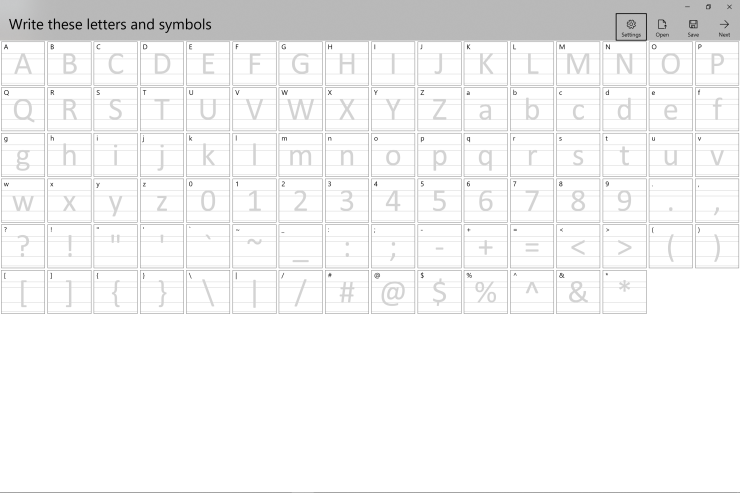 Font Maker показує користувачу шрифтову сітку з напівпрозорими літерами, цифрами та спецсимволами. Їх потрібно обвести, бажано стилусом. Потім сервіс просить написати декілька фраз різної довжини та налаштувати основні характеристики шрифту: інтервали між символами та словами, розмір.