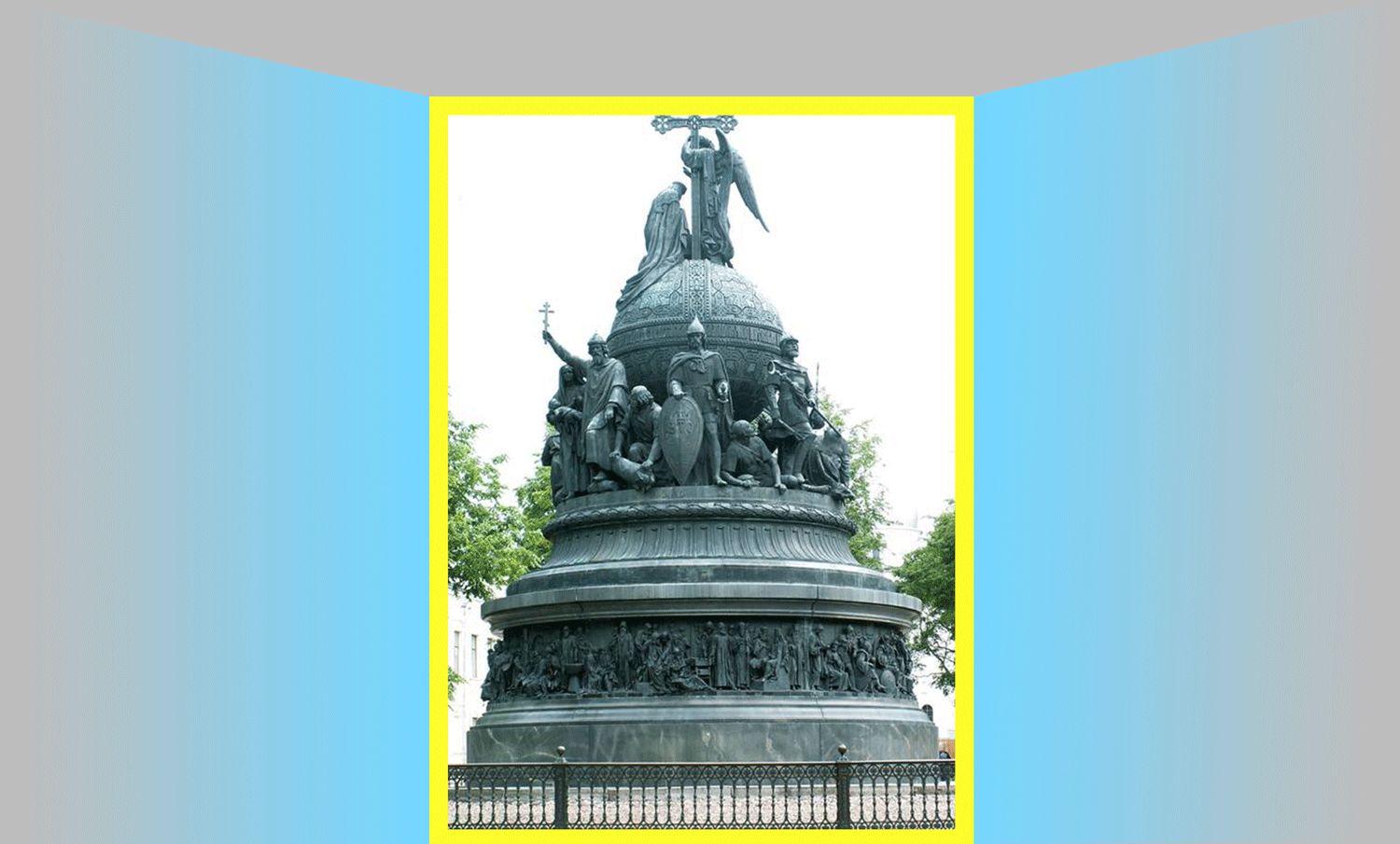 Так, київські Св. Рівноапостольні князі Ольга і Володимир Великі, князі Святослав Хоробрий, Ярослав Мудрий та Володимир Мономах, Св. Антоній і Феодосій Печерські, Св. Нестор Літописець, Данило Галицький /король – Sic! – Руси/, Костянтин Острозький, Богдан Хмельницький, Петро Могила, Св. Димитрій Ростовський /в миру Данило Туптало/, Феофан Прокопович, Олександр Безбородько, Віктор Кочубей, Микола Гоголь зображені на пам’ятнику Тысячелетие России у Великому Новгороді.
