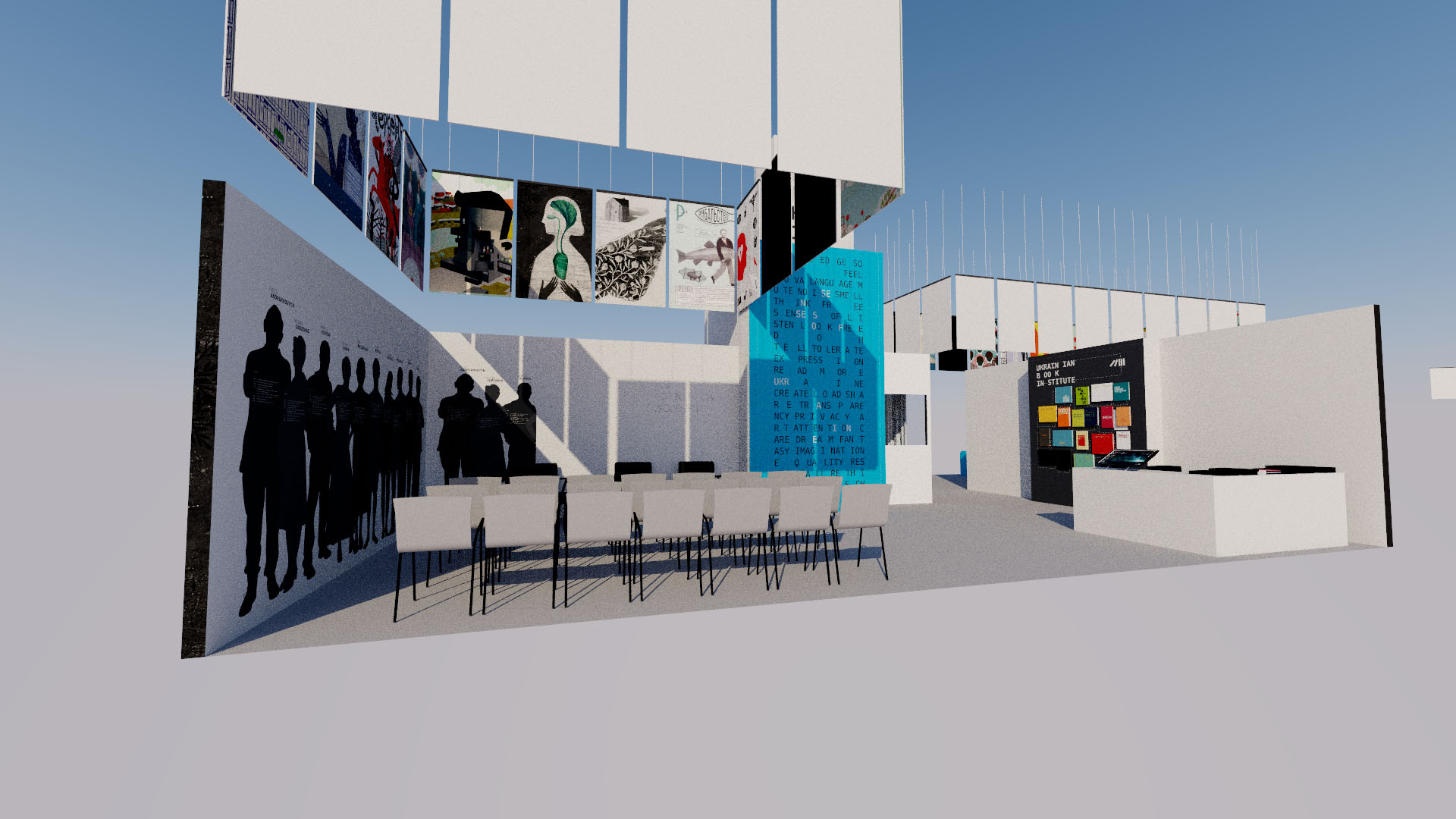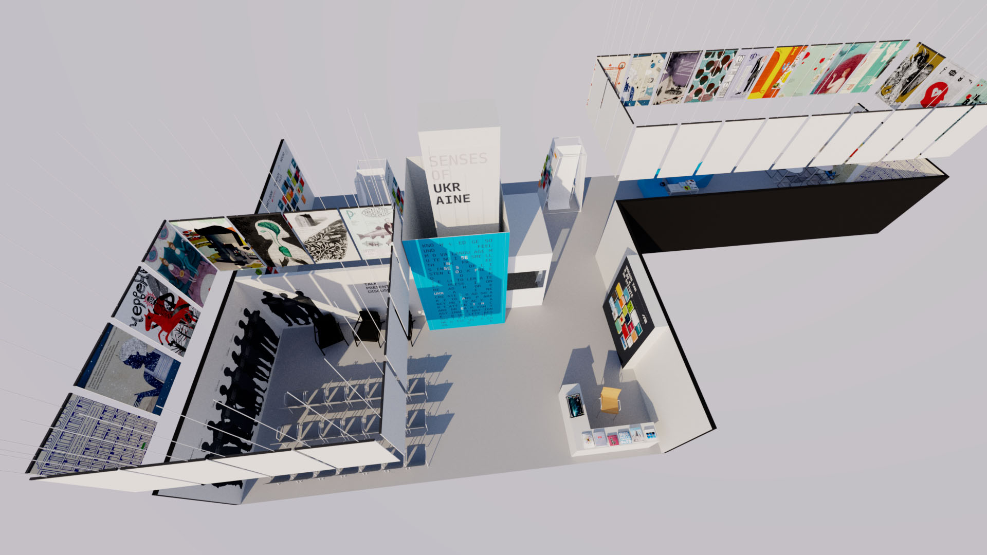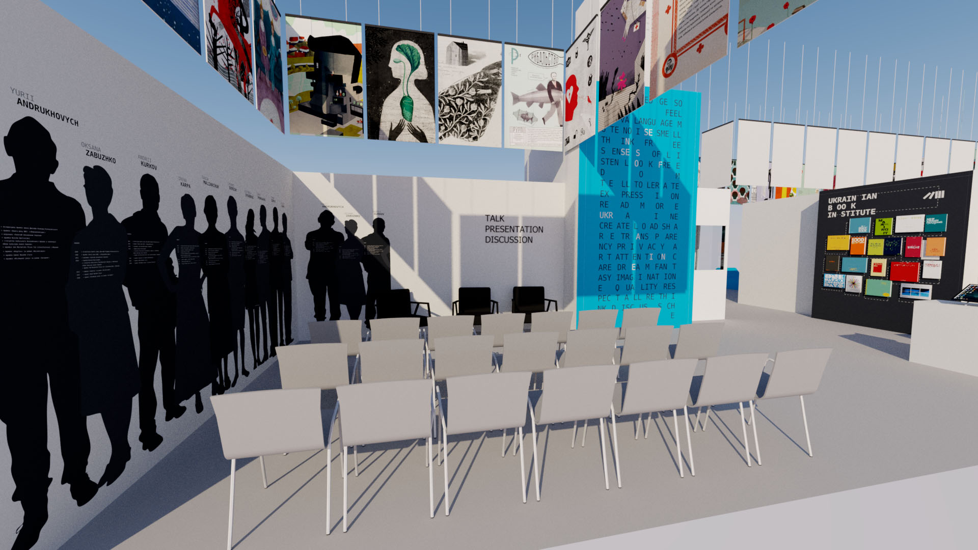 «У роботі над створенням візуально-просторової мови для стенду ми звертаємося не лише до експериментів з типографічним текстом, але й до природи і медіа цифрового тексту. Це дозволяє конструювати висловлювання додаючи процесійне генерування і фізичну взаємодію з цифровими формами тексту», – заявив він.