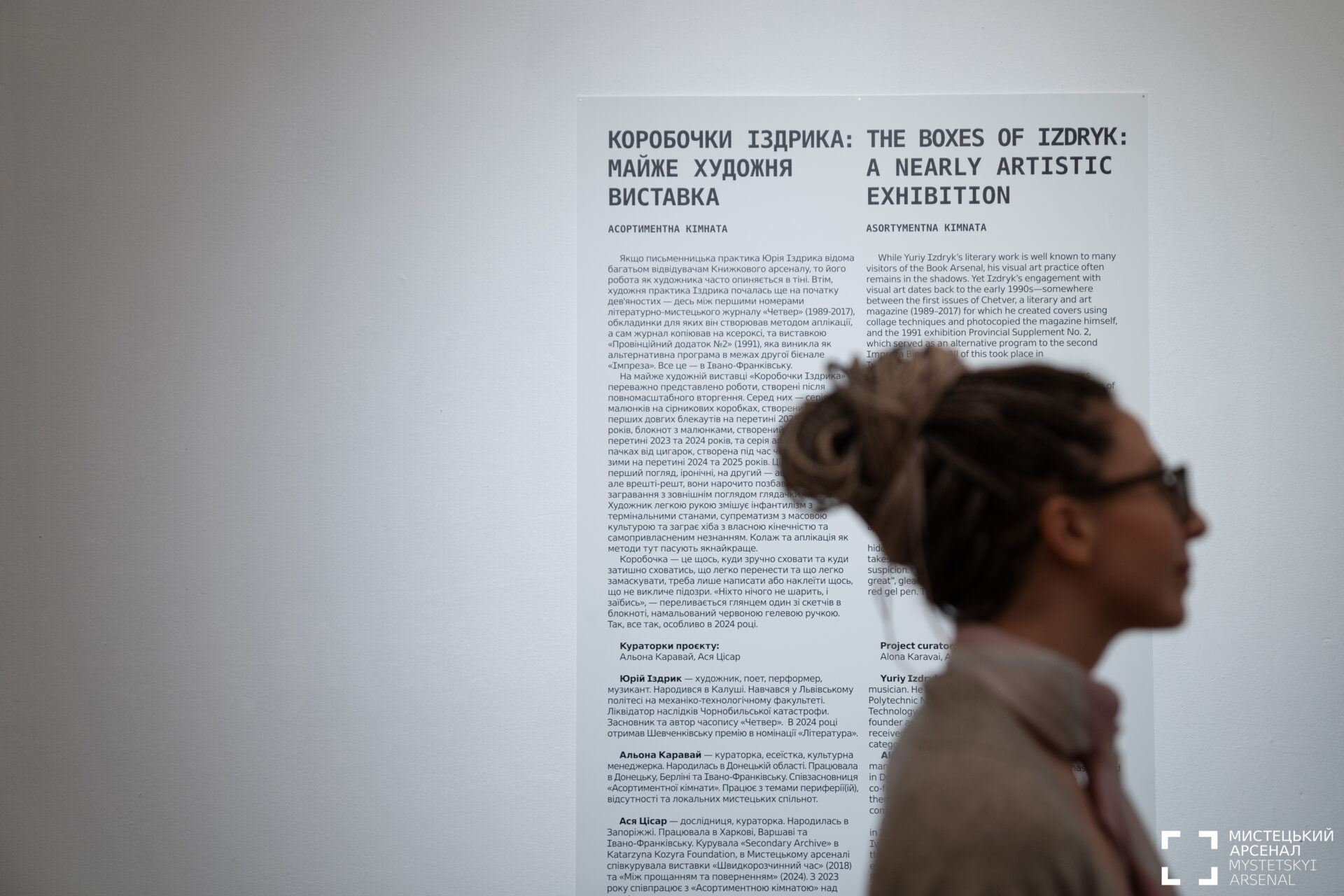 «Малюнки на сірникових коробках, пачках з-під цигарок та блокнот з малюнками, створеними в реанімаційній палаті, — митець жонглює межовими станами, а обривки супрематичних сюжетів змішує у колажі з маскультовими. Іронія, щось, що не потребує зовнішнього погляду, практика на перетині мистецької та автотерапевтичної — усе зібрали у “Коробочки Іздрика”», — зазначають вони.