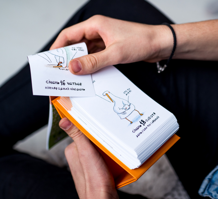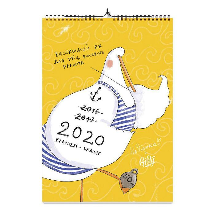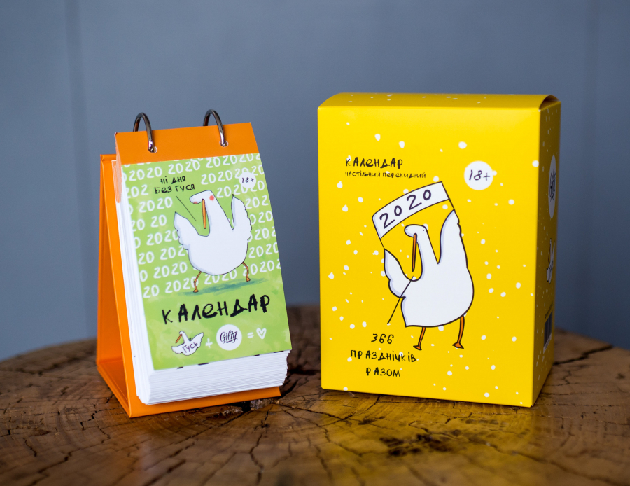 Персону Гуся, якого створила ілюстраторка Надія Кушнір (Надьожна), можна побачити усюди: на посуді, одязі, блокнотах, сумках і, звісно, на календарях. Гусь знає, що «високосний рік – для птахів високого польоту», тому буде щодня давати мотивацію йти до своєї мети й змітати все на шляху. Його злободенна іронія на сторінках перекидного календаря-планера підіймає настрій, а поради забути про справи й нарешті відпочити або влаштувати собі «день шоколаду» дивно переконливі.