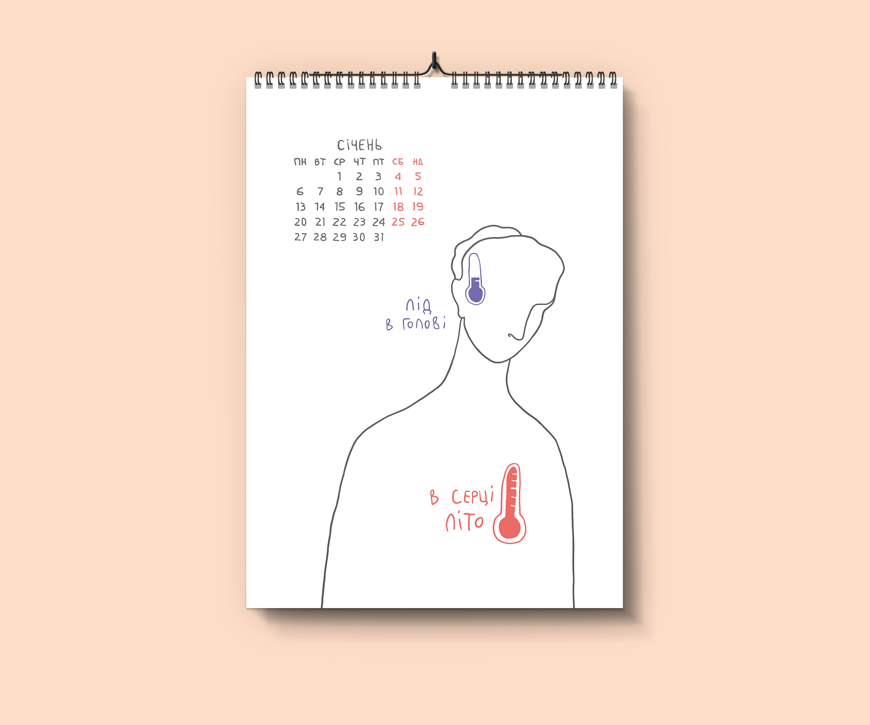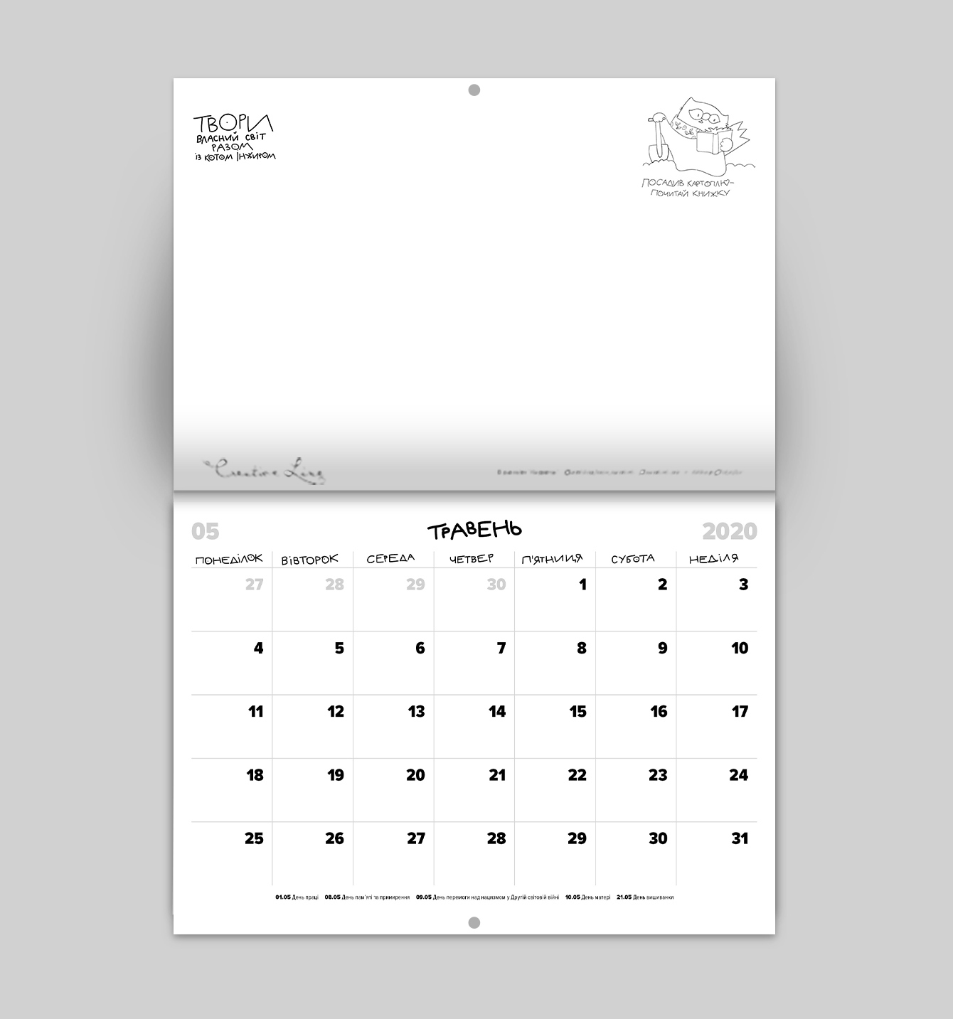 Кожен місяць року календаря від ілюстраторки Альони Жук присвячений якійсь ініціативі чи організації, що змінює світ на краще. Наприклад, сторінку вересня — місяця Маршу за тварин – прикрашає ілюстрація із рухом UAnimals, травня – із проєктом «Zdai Blood».