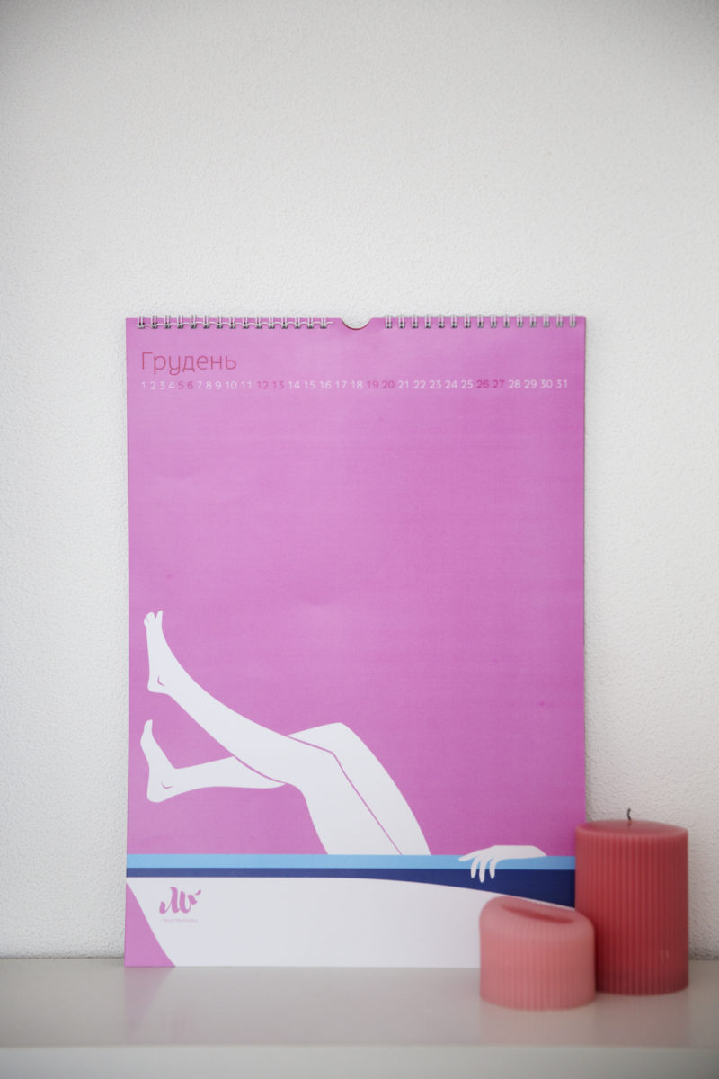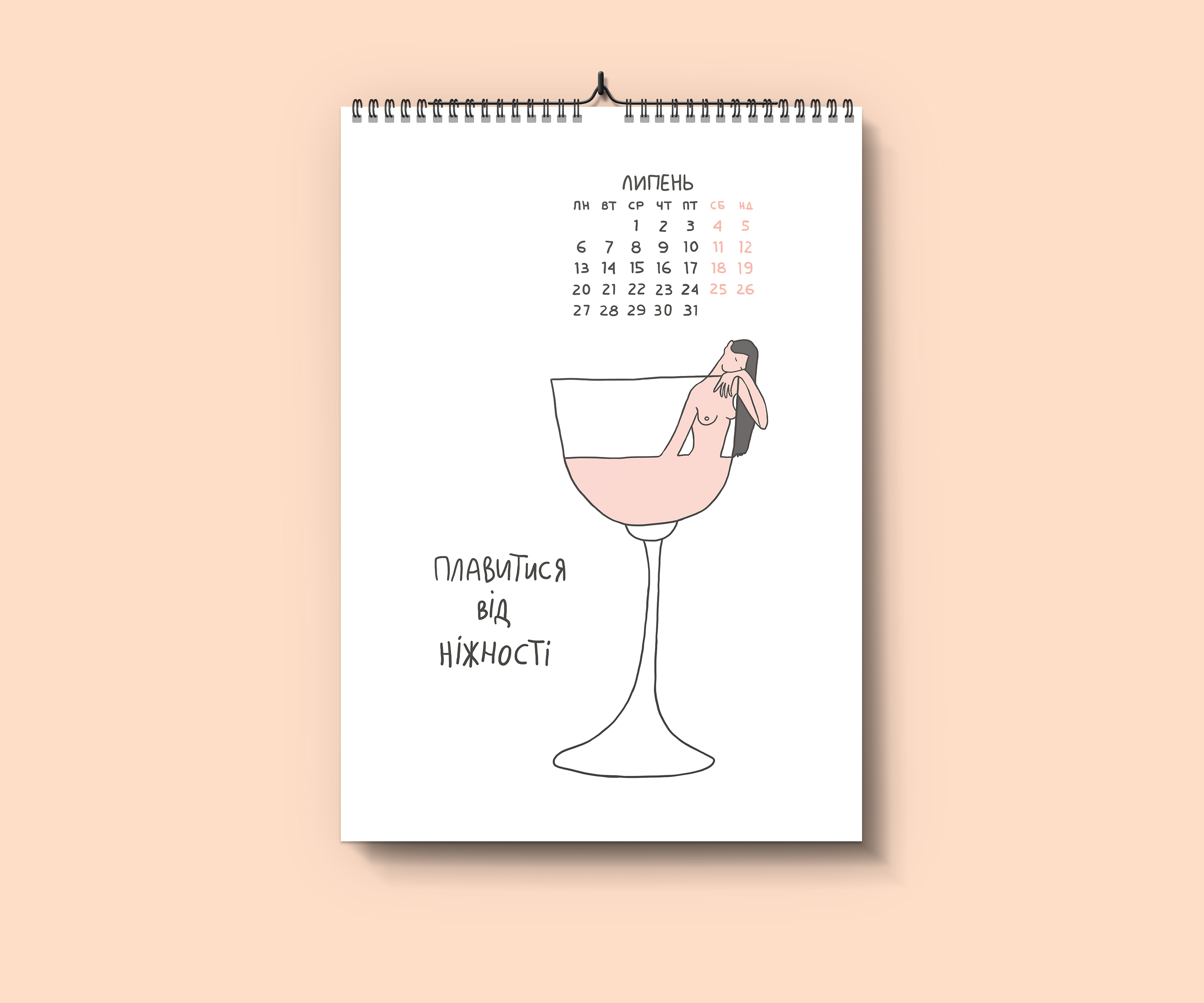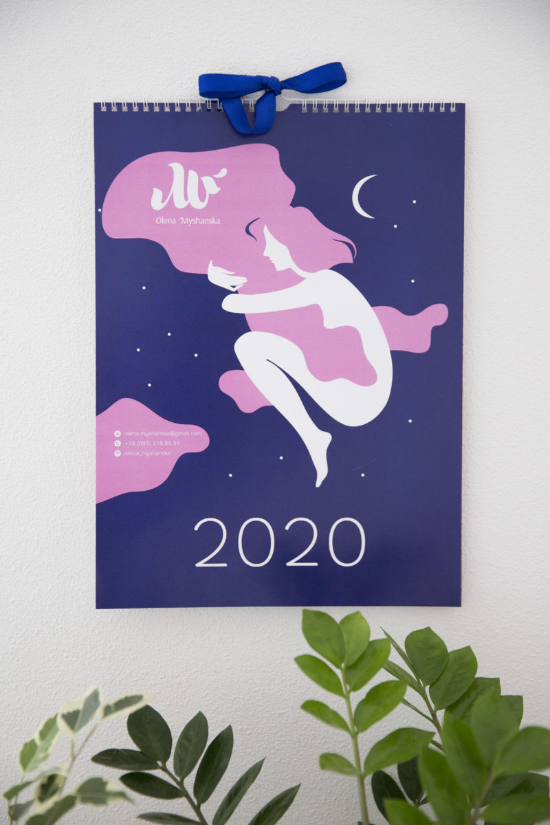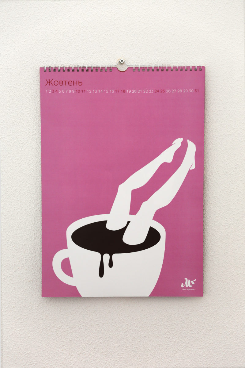 До календаря увійшли графічні роботи з творчої серії #procrastiworking, які Олена Мишанська робить у вільний від комерційних замовлень час. Усі роботи присвячені еротиці, почуттям, задоволенню від життя та красі жіночого тіла. Ілюстрації виконані в мінімалістичній манері та обмеженій кількості кольорів, серед яких трендовий Pantone Classic Blue та доповнені стильною версткою 7 аркушів А3, гарний папір і багато візуального задоволення.