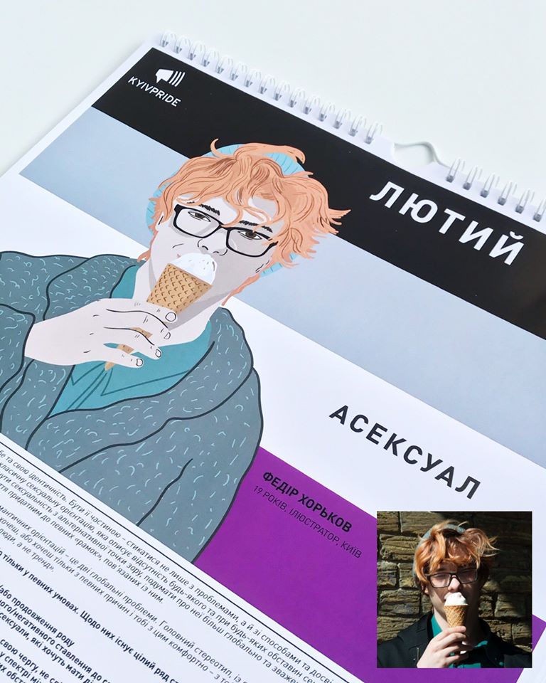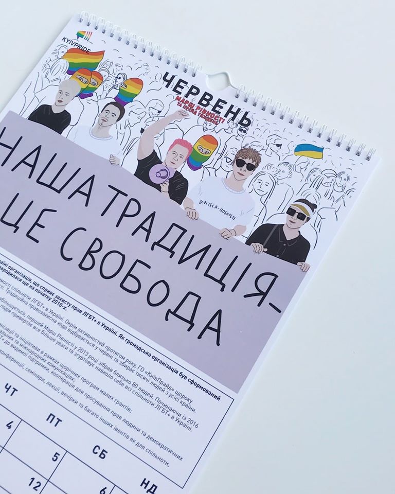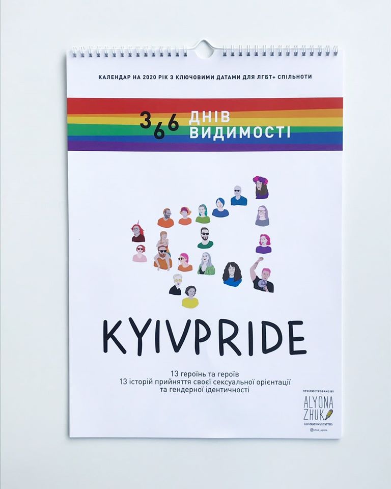 KyivPride підготував до нового року власний ЛГБТ+ календар, який має на меті спростувати міфи та стереотипів щодо кожної субгрупи ЛГБТ+ спільнот. Для цього автори проєкту використали точні цифри статистики й наукові факти та представили кожну субспільноту через призму особистої історії героїв та героїнь. Обличчями місяців стали 13 людей, які поділилися історіями прийняття своєї гендерної ідентичності та сексуальної орієнтації. Також на розворотах кожного місяця – найважливіші дати для ЛГБТ+ спільноти.