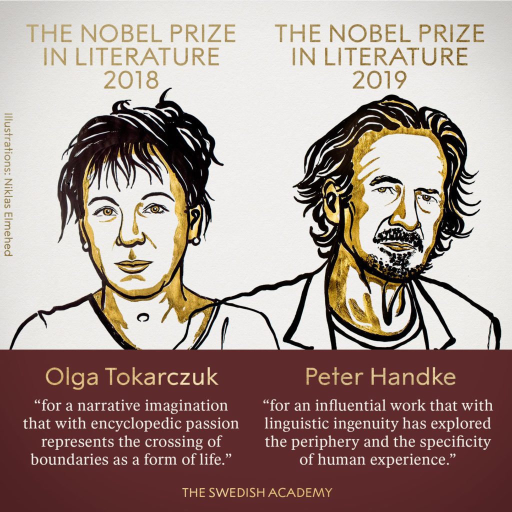 Нобелівську премію з літератури за 2018 рік отримала польська письменниця Ольга Токарчук, за 2019-ий – австрійський письменник Петер Гандке. Такі рішення Нобелівського комітету оголосили під час офіційної церемонії, що проходить у стінах Шведської академії.