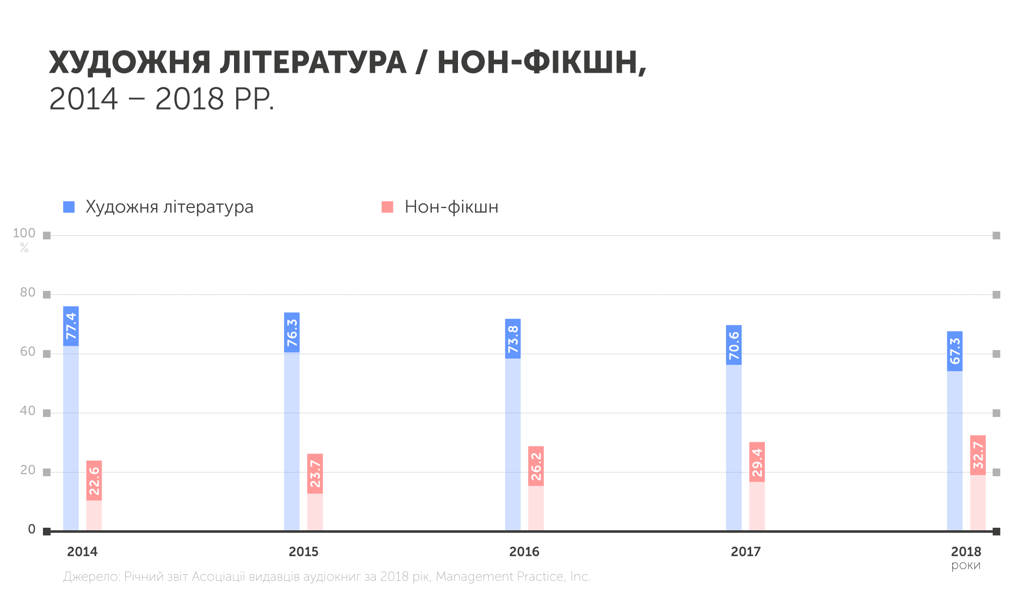 - Найпопулярніші жанри аудіокниг, які купували у 2018 році – художня література: детективи й трилери/гостросюжетна література, а також наукова фантастика/фентезі.