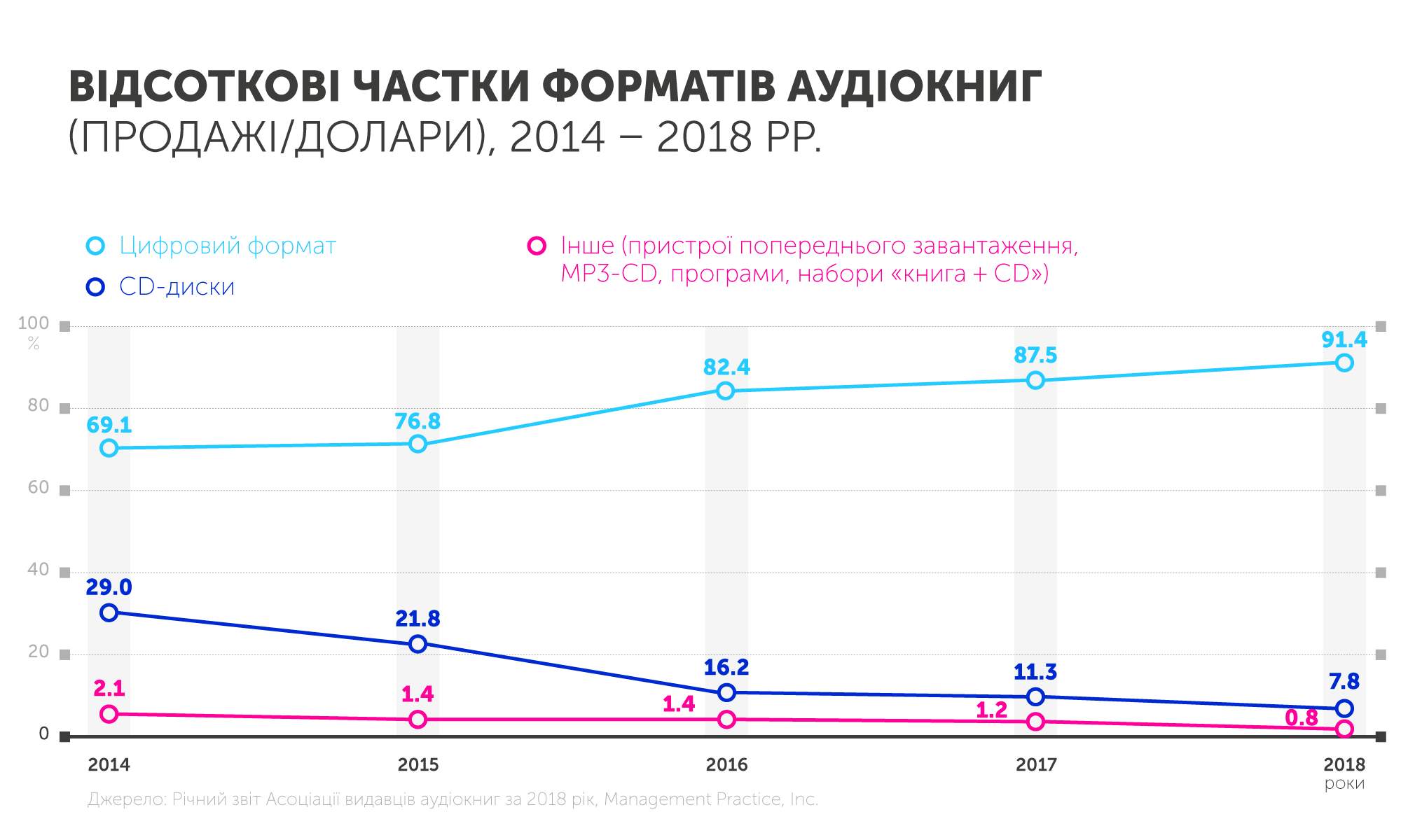 Навіть більше, якщо ви досі користуєтесь CD-дисками й записами на касетах, саме час відмовитись від них і подивитися на схему: 91,4% доходів від аудіокниг у 2018 році, згідно зі звітами, були отримані від використання цифрових файлів.