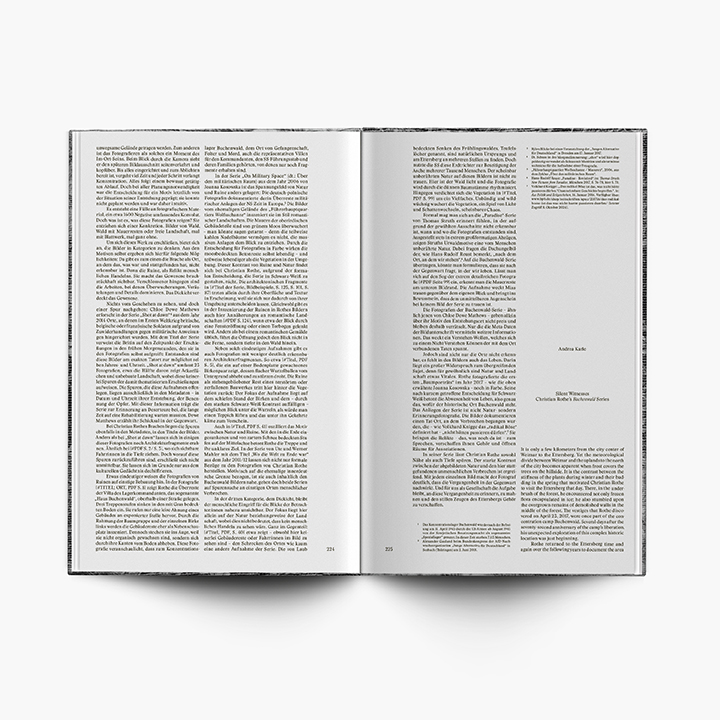Там також зазначають, що чорно-білі світлини вступають у діалог із поемою «Зв’язаний ліс» Жозе Фості і літературними уривками з романів колишніх в’язнів концтаборів — Бруно Апіца («Голі серед вовків»), Імре Кертеса («Без долі») та Хорхе Семпруна («Який прекрасний недільний день!»). Есей голови Всесвітньої ради церков Генріха Бедфорда-Штроома, упорядника Ґюнтера Єшоннека та кураторки Андреа Карле доповнюють видання роздумами про мову фотографій Крістіана Роте та значення сучасної культури пам’яті.