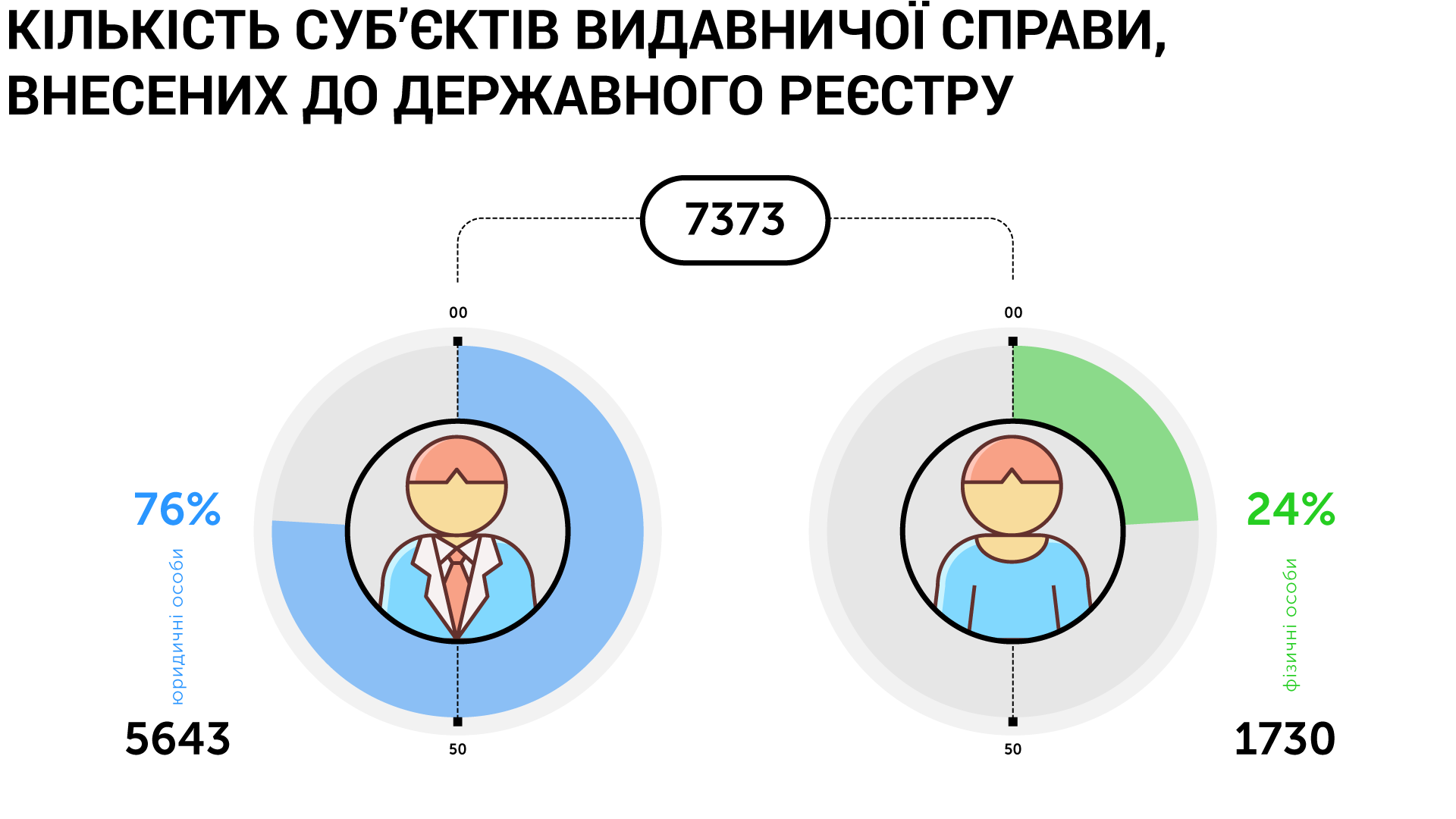 Усього до Державного реєстру внесено 7373 суб’єкти видавничої справи (5643 — юридичні особи, 1730 — фізичні особи).