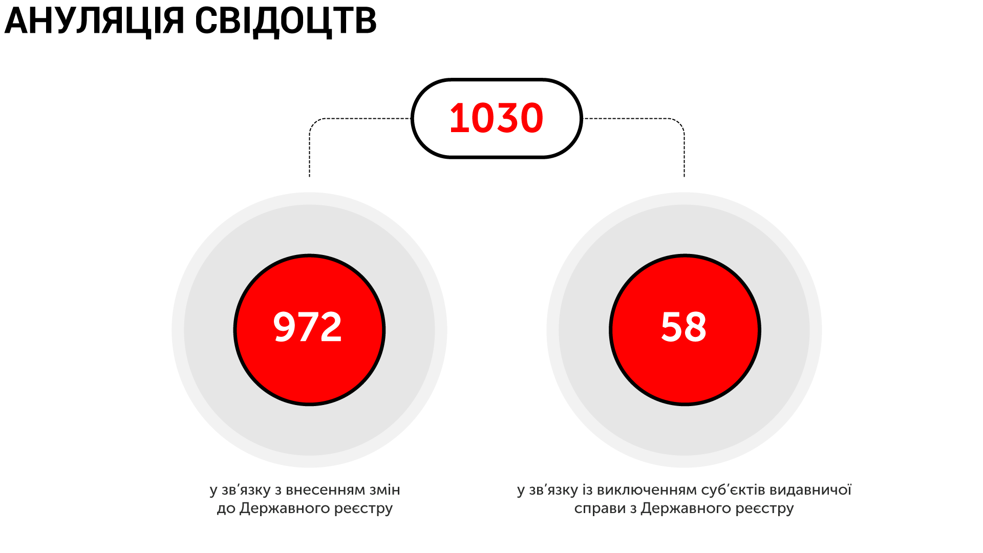 За весь період ведення Державного реєстру було анульовано 1030 свідоцтв (972 — у зв’язку з внесенням змін до Державного реєстру; 58 — у зв’язку із виключенням суб’єктів видавничої справи з Державного реєстру).