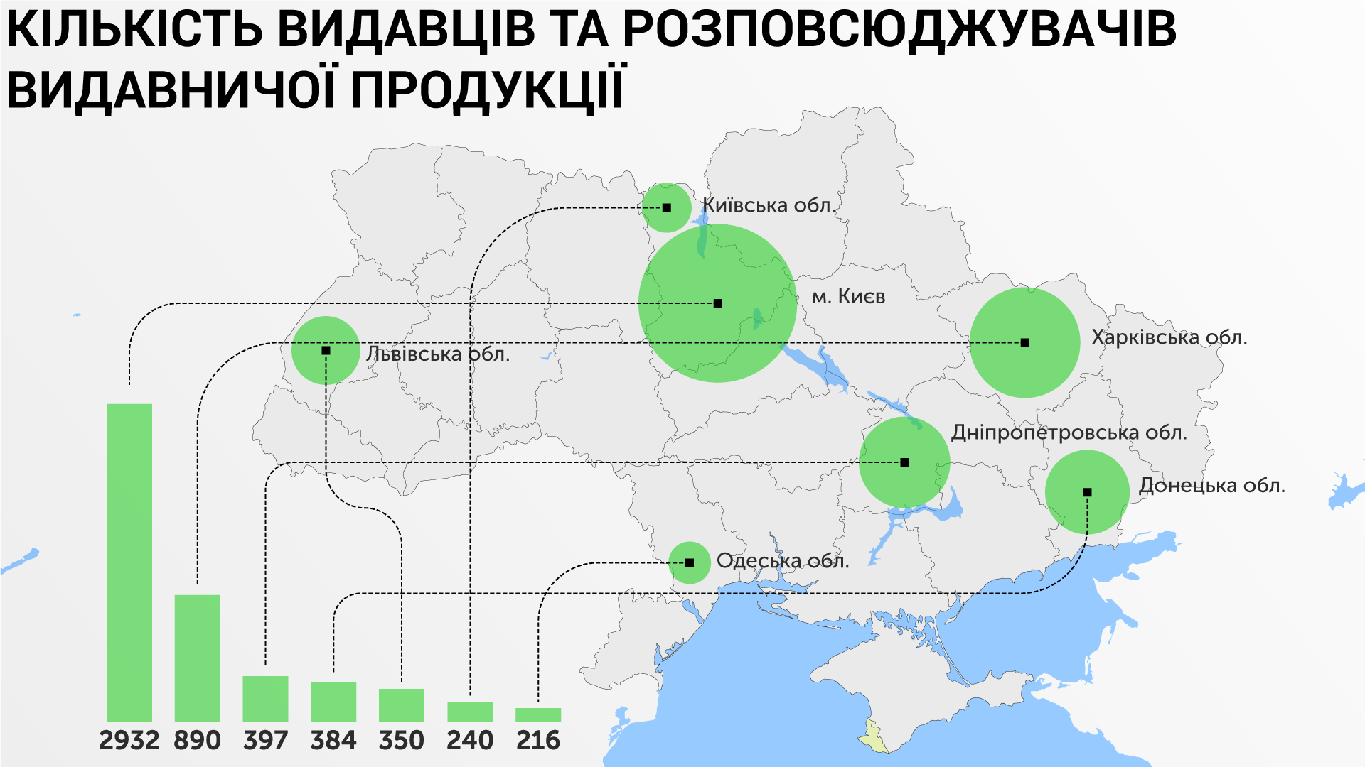 Найбільше видавців та розповсюджувачів видавничої продукції зареєстровано в Києві (2932). До лідерів також увійшли Харківська (890), Дніпропетровська (397), Донецька (384), Львівська (350), Київська (240) та Одеська (216) області.