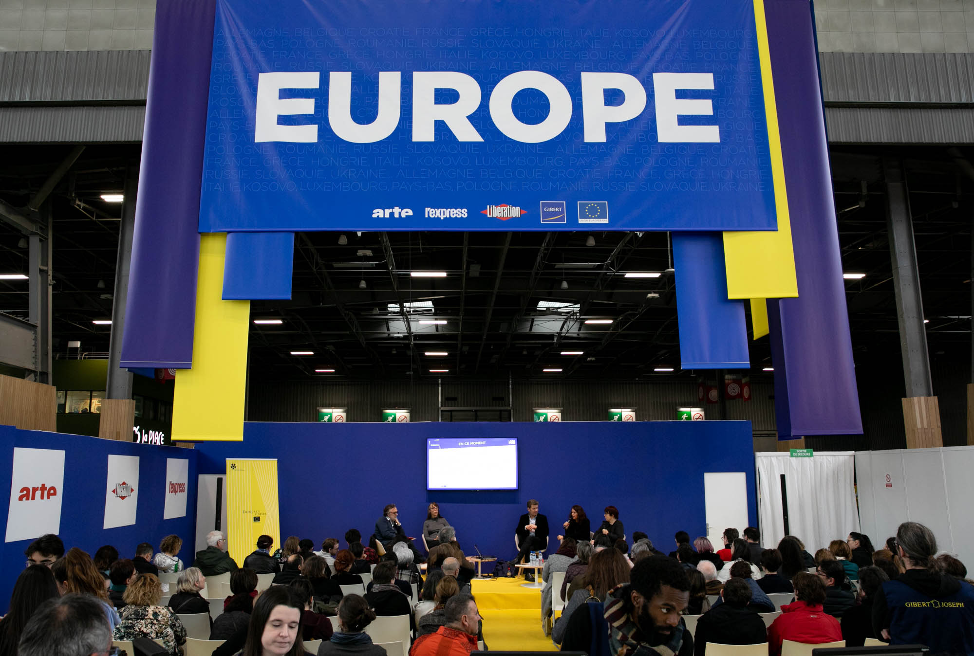 Український стенд розташувався зовсім поруч із цією головною сценою, з нього було добре видно (і це було приємно бачити), що декор сцени «Europe» створений у синьо-жовтих кольорах. Про український стенд згадую не випадково, адже Україну запросили долучитися до цього загальноєвропейського майданчика. Темою запропонованої події стала розмова про «Європу жінок», де дискутували Ірена Карпа та Андрій Курков. Цю дискусію мені випала честь модерувати, тому з висоти подіуму я бачила абсолютний аншлаг в залі, а також чула цікаві запитання від присутніх глядачів.