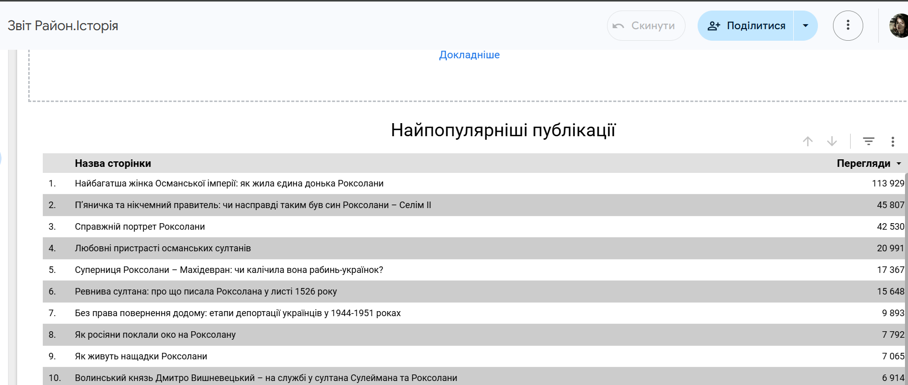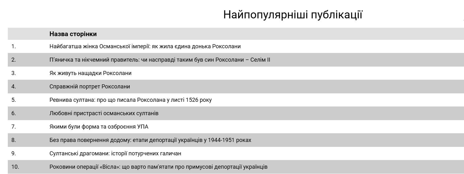 За словами авторки, глядачі цієї категорії часто перевіряють достовірність фактів із серіалу, тож шукають дані про історичний період і знаходять її публікації. Найпопулярніші матеріали літа: «Справжній портрет Роксолани», «Кавалерист чи султана: таємниці львівського портрету Роксолани», «Спадок Роксолани», «Любовні листи Роксолани», «Імператриця турків: королівська величність або титули Роксолани», «П’яничка та нікчемний правитель: чи справді таким був син Роксолани – Селім ІІ», «Найбагатша жінка Османської імперії: як жила єдина донька Роксолани?». Бували дні, коли топ-20 найчитаніших статей складався лише з її текстів.