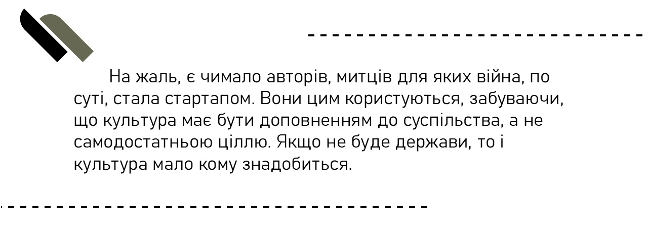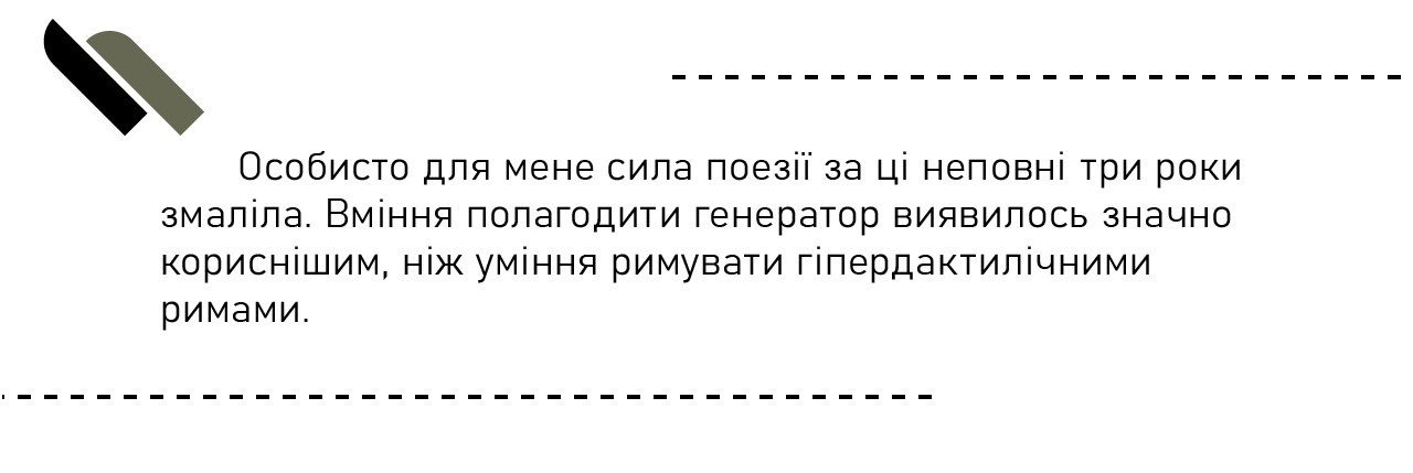 — Щодо якихось загальних новин чи тенденцій у суспільстві — чесно кажучи, вони емоційно проходять повз мене. І повз більшість військових, із якими я служу. Нас хвилює, наприклад, чи справна машина, якою ми маємо їхати на позиції. У всіх тут величезна кількість справ і відповідальностей, які треба виконувати прямо зараз. Якщо почати розпорошувати увагу й енергію на те, що не має прямого стосунку до нагальних завдань, — ти не виконаєш свою роботу добре.