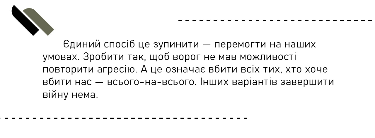 — Якось на фейсбуці ви нагадали, що ця війна — на знищення, і єдиний спосіб вижити — вбити їх раніше, ніж вони вб’ють нас. Щоб не лишити їм шансу знову прийти до нас з війною. Що сьогодні вас непокоїть найбільше?