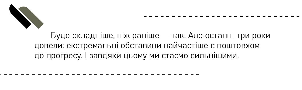 Або осінь-зима 2023-го: тоді ми майже не мали постачання боєприпасів від союзників. Ситуація на фронті була критичною. І саме тоді з’явились ударні FPV-дрони, дрони-камікадзе — більшість комплектувальних до яких виробляються в Україні. І за півтора року ми стали провідною армією світу в цьому напрямі. Ми стали менш залежними від союзників у плані озброєння — бо змогли створити власну альтернативу. Тож, навіть якщо в майбутньому втратимо якогось потужного партнера, — вірю, що знову станемо сильнішими. Або… не витримаємо взагалі.