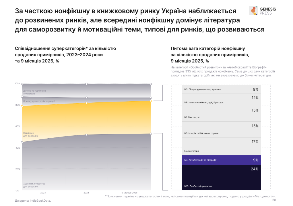 У 2023–2025 роках частка нонфікшну для дорослих на книжковому ринку невпинно збільшується: якщо ще кілька років тому він поступався художній літературі, то зараз є одним з популярних жанрів.