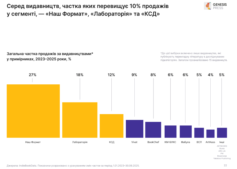 У продажах 2023–2025 років за кількістю проданих примірників три видавництва мають частку понад 10%: «Наш Формат» — 27%, «Лабораторія» — 18%, «КСД» — 12%, Vivat — 9%, BookChef — 8%, КМ-БУКС і Фабула — по 6%, ВСЛ — 5%, ArtHuss — 4%, інші — 5%. Загалом половину продажів новинок 2025 року забезпечили українські книжки.