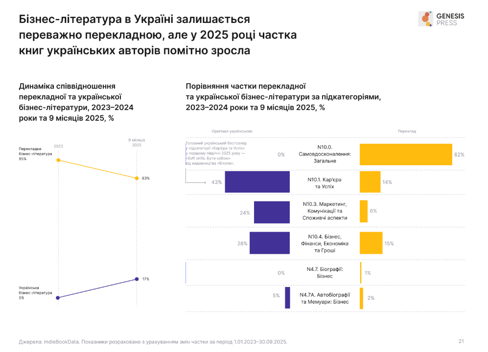 У 2024 році частка українських бізнес-книжок зросла з 5% до 17%. До 2023 року 95% бізнес-книжок на полицях були перекладними. Наразі цей показник становить 83%.