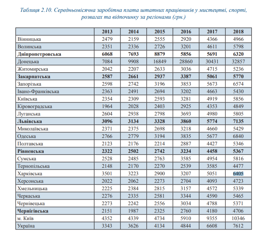 Працівники сфери мистецтва, спорту, розваг та відпочинку у 2018 році в середньому отримували заробітну плату в розмірі 7 тис. 612 грн на місяць. Про це свідчать дані, оприлюднені в аналітичній доповіді Інституту економічних досліджень та політичних консультацій «Економічна привабливість української культури».