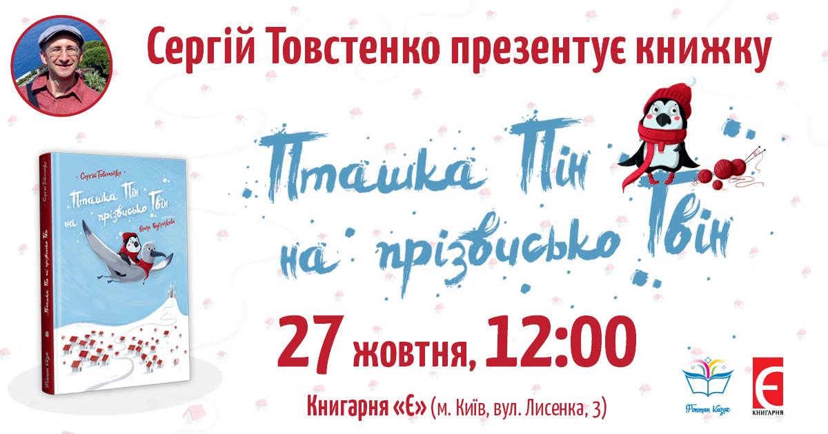 Книгарня «Є» (вул. Лисенка, 3) та видавництво «Фонтан казок» запрошують на презентацію повісті Сергія Товстенка «Пташка Пін на прізвисько Гвін» у суботу, 27 жовтня о 12:00.