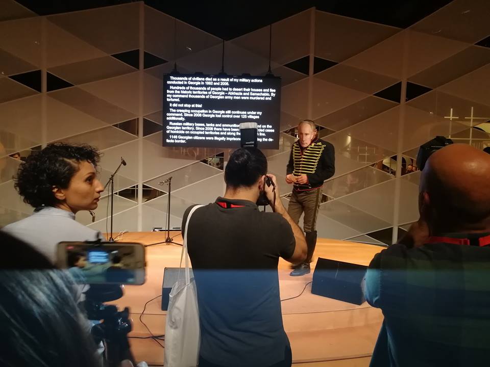 «Як ви знаєте, два важливі регіони Грузії (20% від усієї території) окуповані Росією. До того ж, Росія повільно наближається до Грузії так званою «повзучою окупацією». Ми не можемо відповісти з однієї простої причини – ми маленькі. Тому все, що ми можемо зробити – це нагадувати світові знову і знову про нашу проблему. Бо, на жаль, ми не настільки сильні, щоб протистояти їй», – заявили під час акції у грузинському павільйоні організатори.