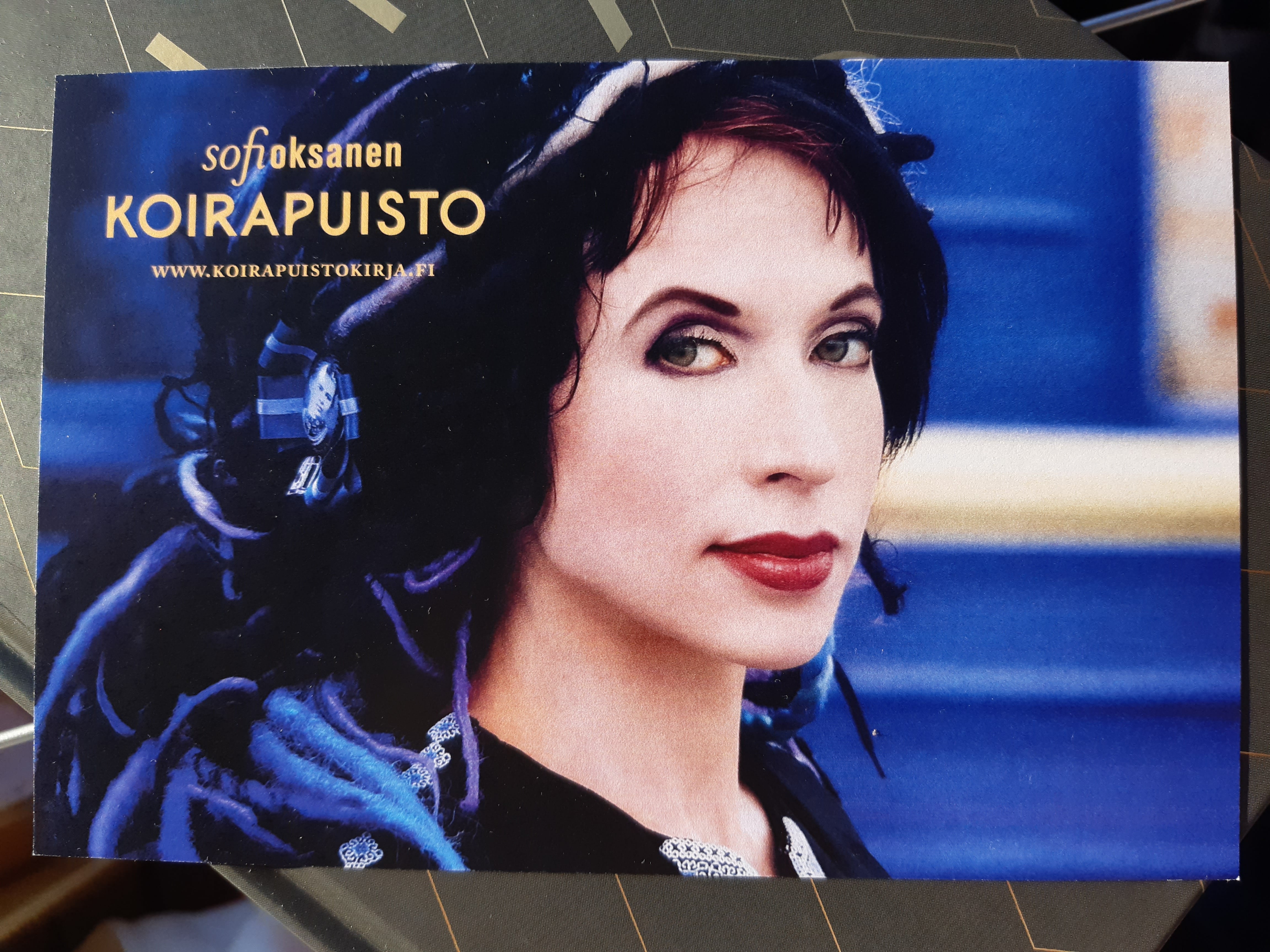 У її волоссі – брошка із фотографією Лесі Українки, на сукні – вишиті вставки, сама Софі стоїть на тлі потяга «Укрзалізниці», жовто-блакитна кольористика якого передає вже зовсім очевидний меседж – тут ідеться про Україну. Цей портрет Оксанен супроводжує всю промо-кампанію її нової книжки «Собачий парк» (фінською – Koirapuisto). Софі, відома жорсткими романами про самоідентифікацію, насилля і радянський спадок, дія яких розгортається в Естонії, тепер написала й про Україну.