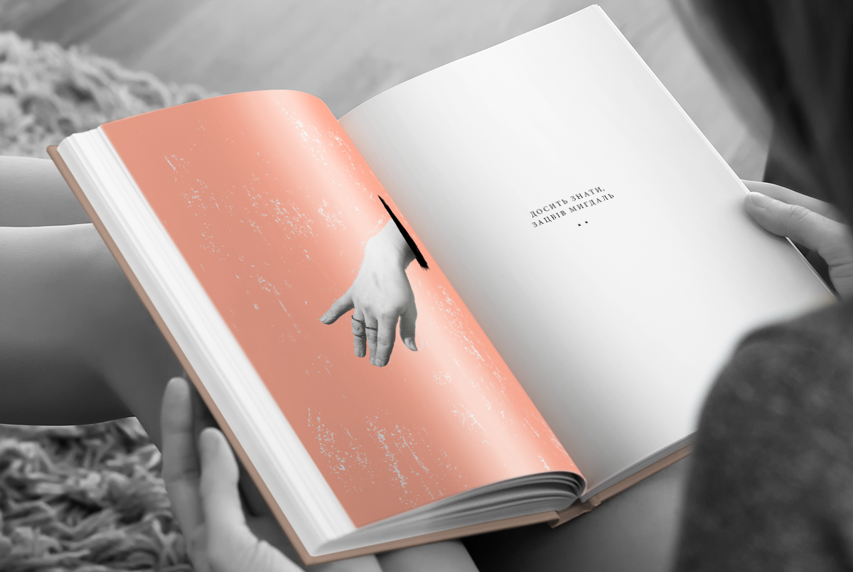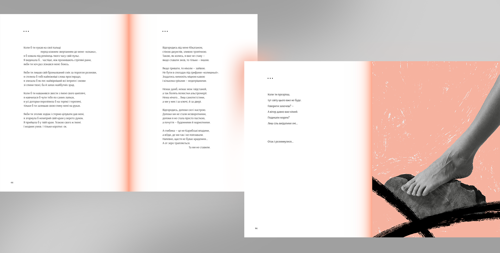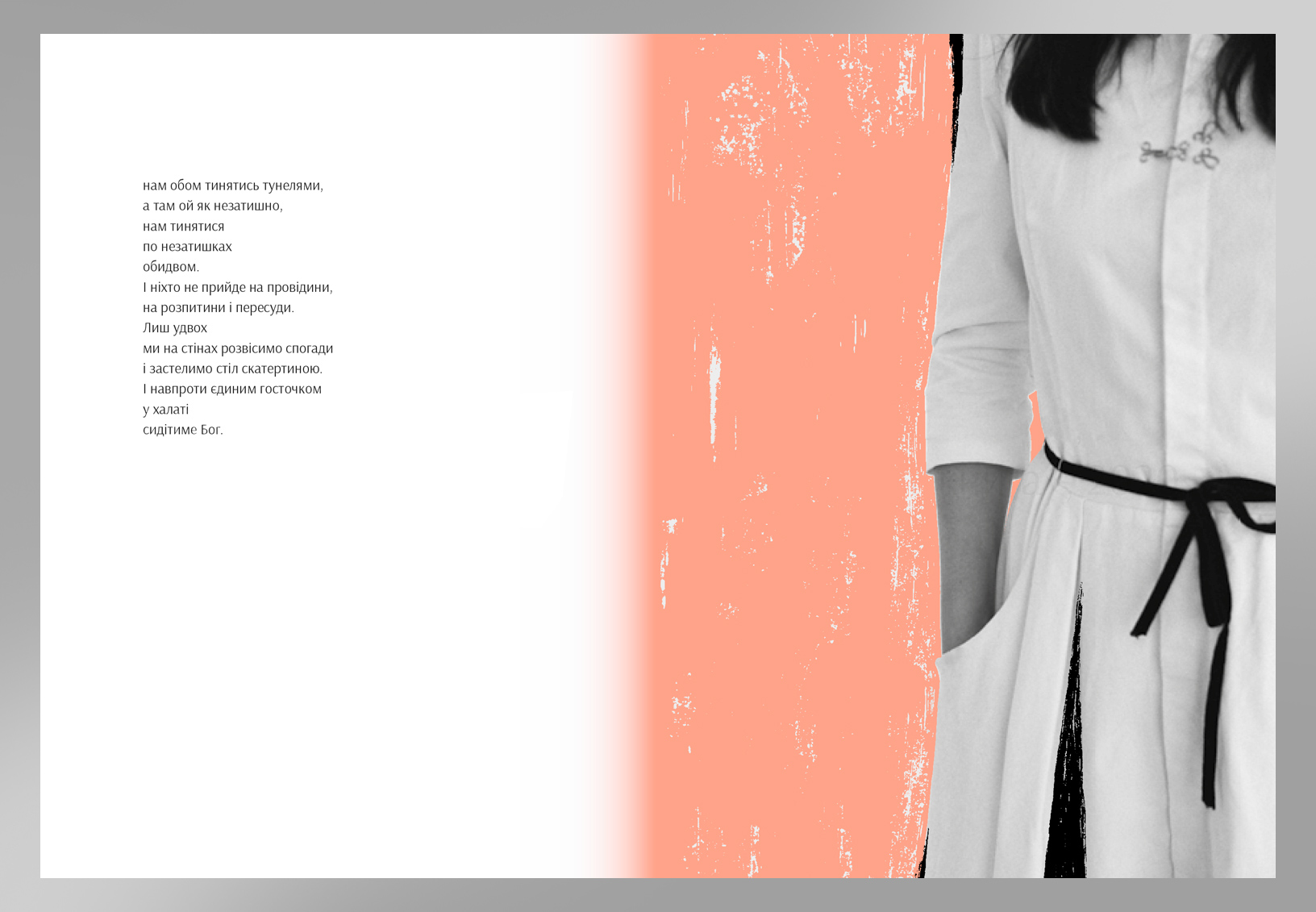 Романа Рубан: «Ми не даємо обличчя героїні, не бачимо де вона, хто вона. З-за кольорового тла лише фрагментарно даємо змогу підглянути за героїнею, або приміряти образ на себе. Фокусуємо читача на зміні: від оголеності на титулі до вбраності, якою ілюструємо останній вірш».