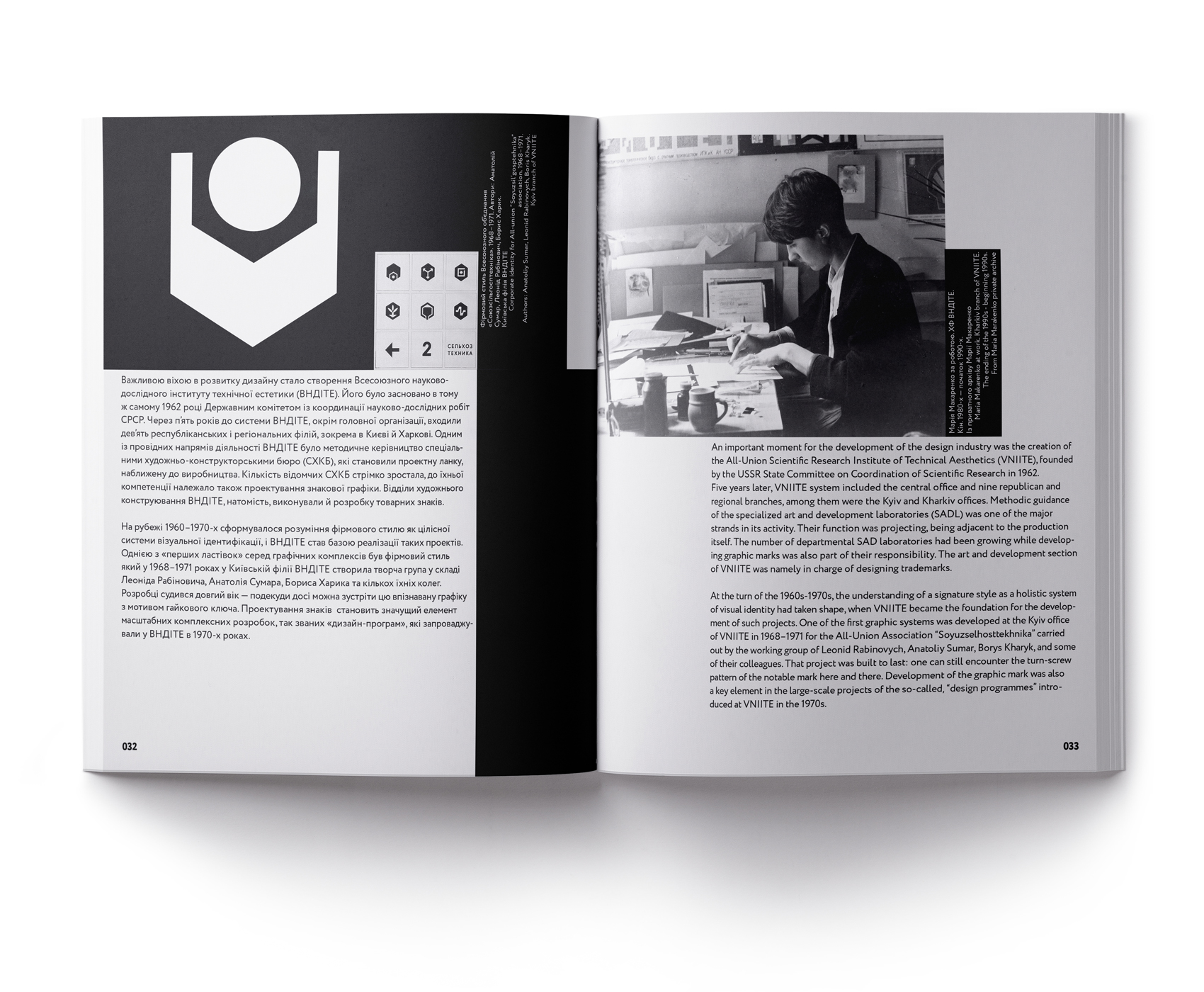 Ми поєднали чорно-білі й стримані за кольором архівні матеріали, естетику яких добре підтримує друк на шорсткуватому офсеті теплого відтінку, з заставками до розділів й обкладинкою, для яких використали «сяючий» грейпфрутовий пантон.