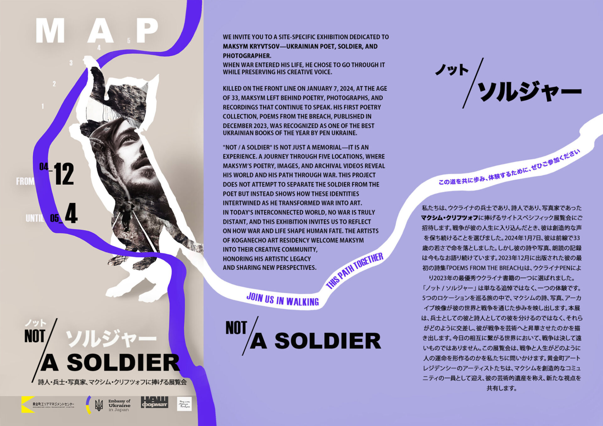 Виставка «not / A SOLDIER» втілює задум Максима Кривцова – поєднати повсякденні образи війни з мирним міським життям. У межах виставки експонують його вірші, фотографії та відеоінсталяції. Серед основних локацій – Koganecho Art Book Bazaar з поетичними виданнями, Gallery Yusui з фотопроєктом «Зупинка: Війна» і Gala House з інтерактивними інсталяціями. На локації THE ROOM щовечора з 18:00 до 21:30 на вулицю транслюють відеозаписи авторських читань Кривцова з фронту.