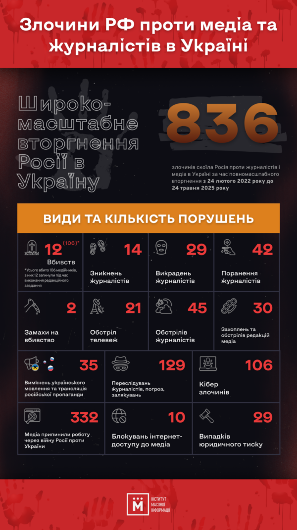 За 3 роки і 3 місяці від початку повномасштабного вторгнення росія скоїла 836 злочинів проти журналістів та медіа в Україні. Про це свідчать дані моніторингу російських злочинів проти журналістів та медіа, який проводить Інститут масової інформації (ІМІ).