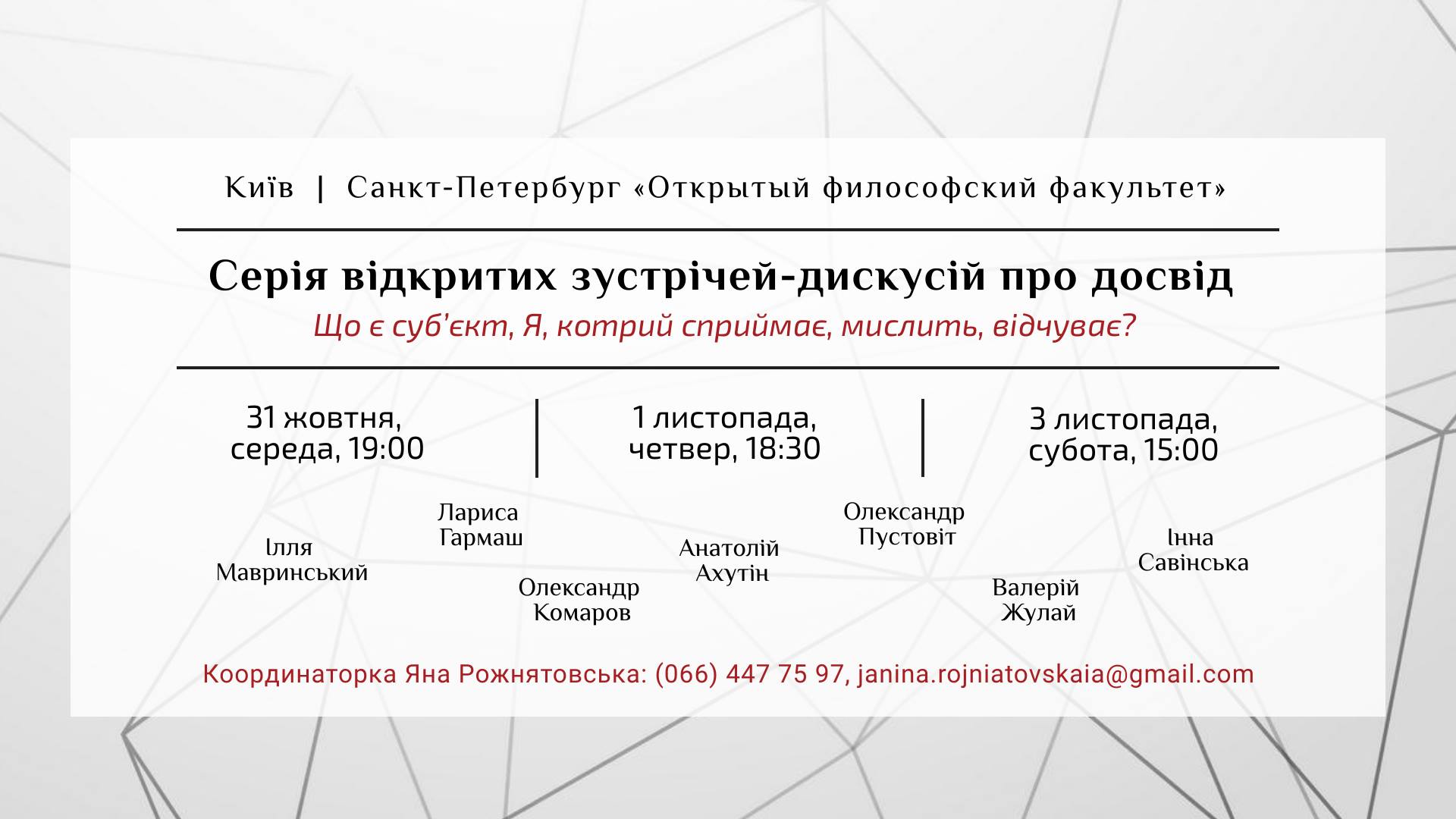 1 листопада, четвер, 18:30 «Підстава і безпідставність суб’єкта. Незмінності “посилу долі”». Адреса: вул. Деревлянська, 13 (ст.м. «Лук’янівська», Інститут релігійних наук).