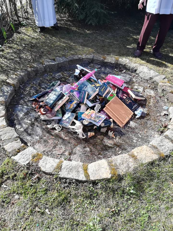 Також до вогнища потрапив і роман «Сутінки» Стефані Майер та інші предмети, які організатори акції вважають такими, що пропагують магію та чаклунство.