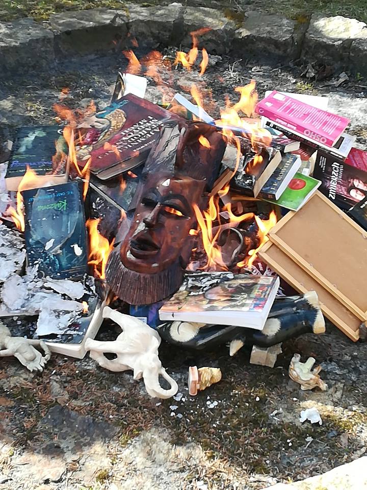 У пості, який присвячений спаленню, говориться про те, що книжки потрапили до вогнища, бо суперечать християнському вченню, а Біблія засуджує чаклунство.