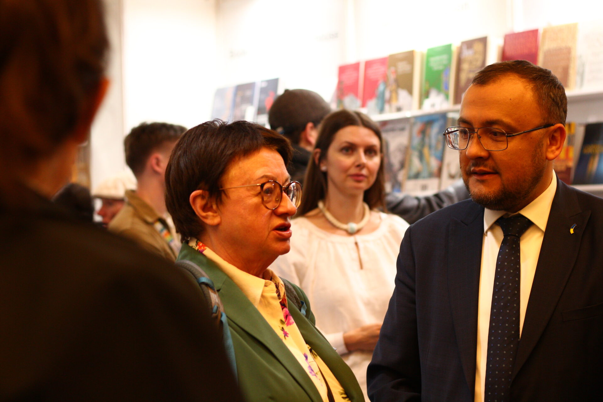 У день відкриття стенд відвідали надзвичайний і повноважний посол України в республіці Польща Василь Боднар та міністерка культури Польщі Ганна Врублевська. «Ми говоримо зараз про силу слова — силу, яка йде від наших авторів і видавців, але також від наших воїнів і нашого керівництва. Сила слова сьогодні грає особливу роль, і я хочу, щоб кожен відчув, як воююча країна представляє себе тут, у Варшаві — місті, яке допомогло мільйонам українців врятуватися, зберегти життя, знайти себе і допомагати Україні», — сказав на відкритті стенда Василь Боднар.