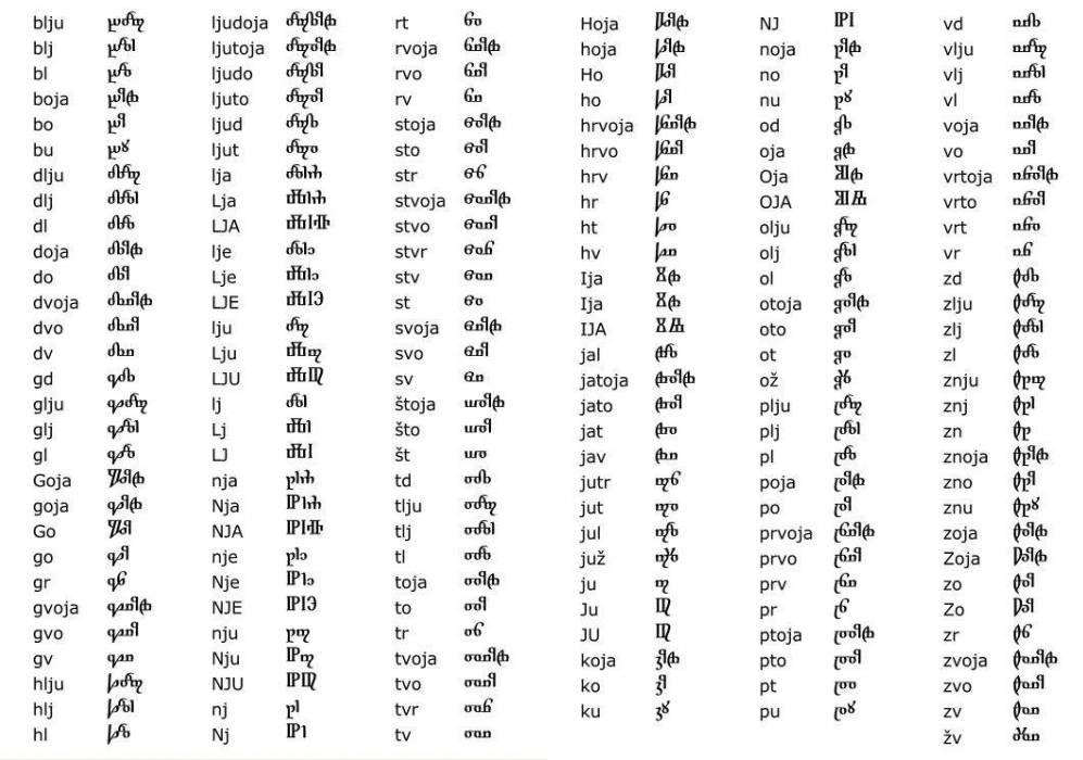 - Давніша «кругла» (хорв. Obla glagoljica), також відома як болгарська. Це оригінальна форма абетки, що характеризується округлими та складними елементами. Цей варіант чимось нагадує абетки вірмен та грузинів, але якщо поставити їх поруч, ви відразу збагнете, що вони геть різні.