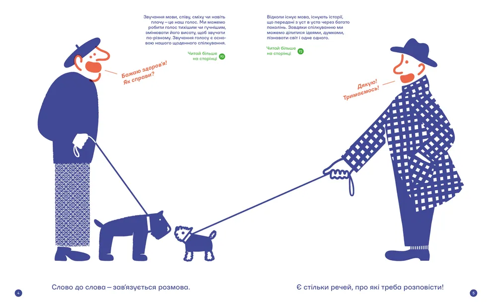 «Ділитися думками та почуттями, знаходити спільну мову, розповідати історії й чути їх, розмовляти очі в очі, або на відстані, чи просто проводити час разом — це і є спілкування. Про двійковий код, абетки Морзе і Брайля, мову жестів, прапорців та фонетичну абетку. А ще про таємні мови, шифри й коди. Про те, як зрозуміти вашого кота, собаку чи папугу. І навіть про те, як спілкуються томати. Усе це та багато іншого ви зможете прочитати та побачити у цій книжці», — йдеться в анотації.