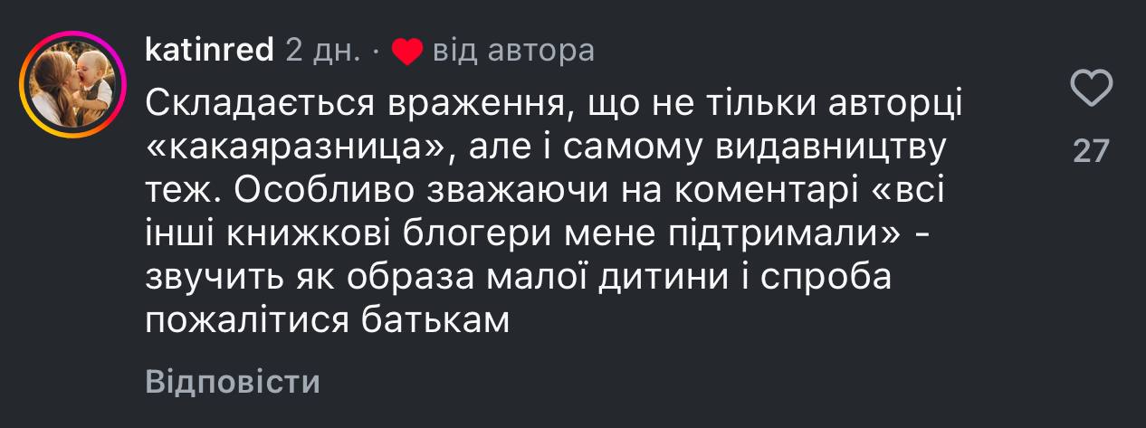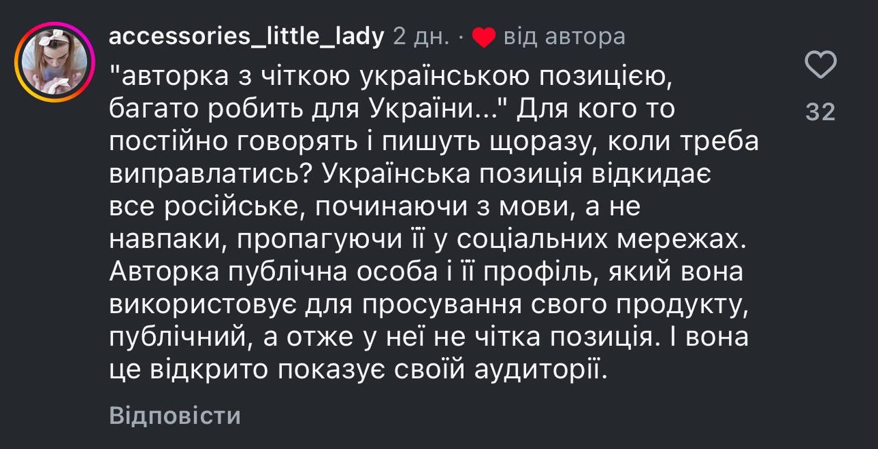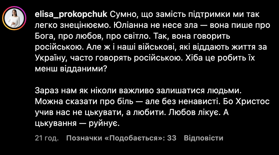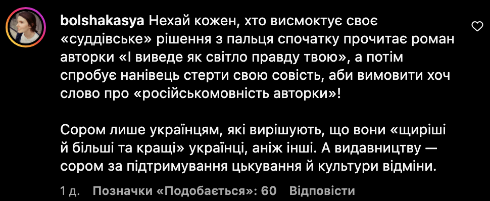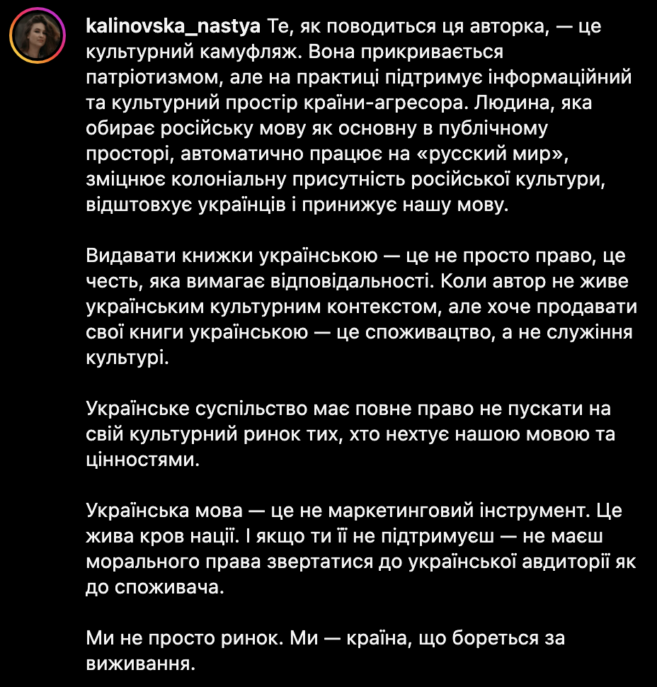«Я — українка. Я — письменниця. І я маю право на голос. Я думаю та розмовляю двома мовами, тому що я громадянка вільної та великої країни. В Україні сьогодні дуже потрібні добрі, світлі, щирі дитячі книги — ті, що підтримують, дарують віру й тепло. І сьогодні мене засуджують. Не за зміст. Не за позицію. Лише за мову. Я — частина української культури. Навіть якщо мій голос звучить інакше», — написала авторка.