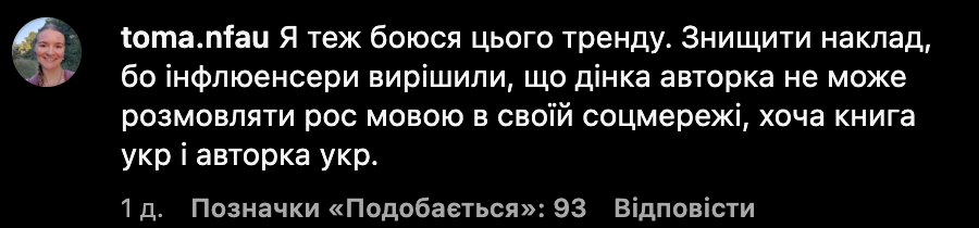 «Я намагалась пояснити, чому видавництво не має просувати таку авторку, навіть якщо книжка українською (переклад з російської, точніше!).Хоча на 4-й рік повномаштабної війни мені вже хочеться плакати від того, що все ще маємо це пояснювати. Публічний простір українця має бути українською», — додала Муравицька.