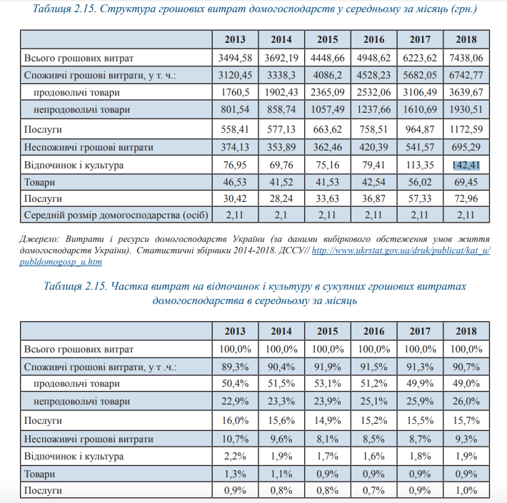 Частка витрат на відпочинок і культуру у 2018 році складала 1,9% від загальних місячних витрат українців – 142,41 грн. Такі дані оприлюднені в аналітичній доповіді «Економічна привабливість української культури» Інституту економічних досліджень та політичних консультацій, створеній за підтримки Українського культурного фонду.
