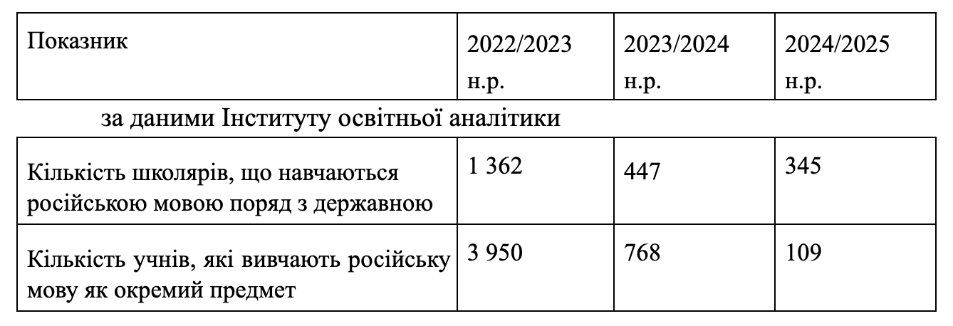 За його словами, у 2021–2022 навчальному році близько 100 тисяч учнів навчалися російською мовою або вивчали її як іноземну. У 2024 році ця кількість скоротилася у тисячі разів — до 345 осіб.