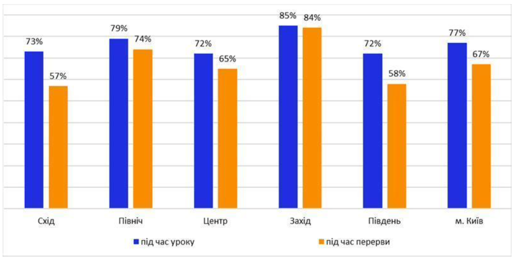 Зменшилась на 8% і частка учнів, які під час уроків та перерв спілкуються між собою виключно українською мовою. Значними є відмінності саме за регіонами проживання: на Заході – 74 %, на Півночі – 40%, в Центрі – 35%, на Півдні – 25%, в Києві – 27%, на Сході – лише 17 % опитаних дітей користуються українською мовою під час навчання.