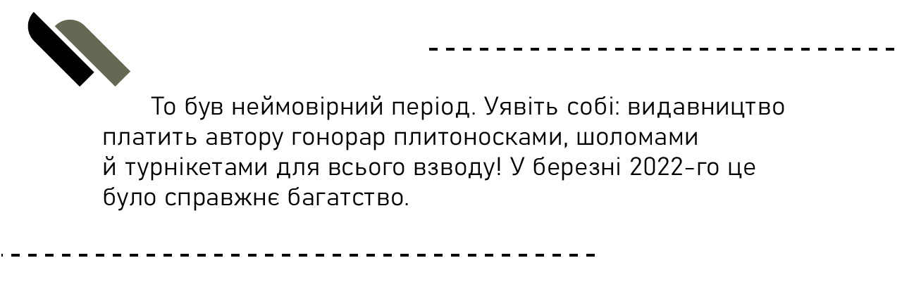 До речі, я коли працюю з текстом, то дуже обережний, а коли ставлю останню крапку — стаю легковажним. Побратими сміялися: мовляв, поки ти пишеш, то постійно в шоломі, і в бронежилеті, і закопуєшся глибше. А щойно закінчуєш — все, уже «нормальний», як усі.